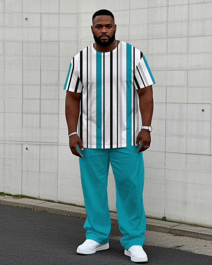 Men's Plus Size Casual Vertical Stripe Lake Blue Printed Short-sleeved T-shirt Trousers Suit
