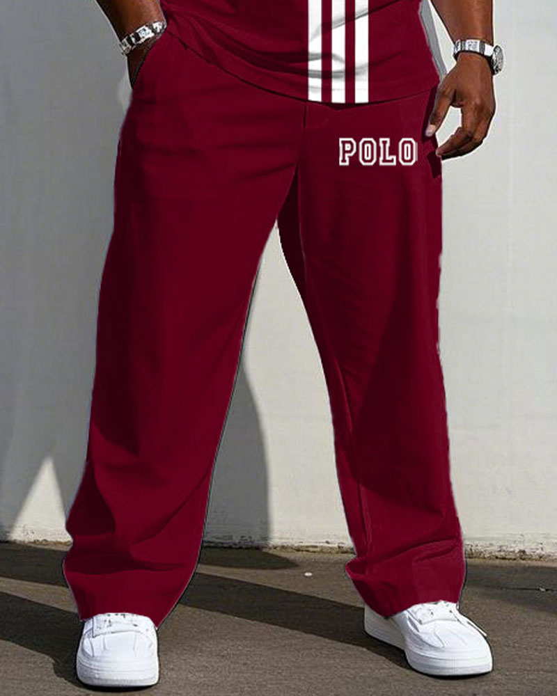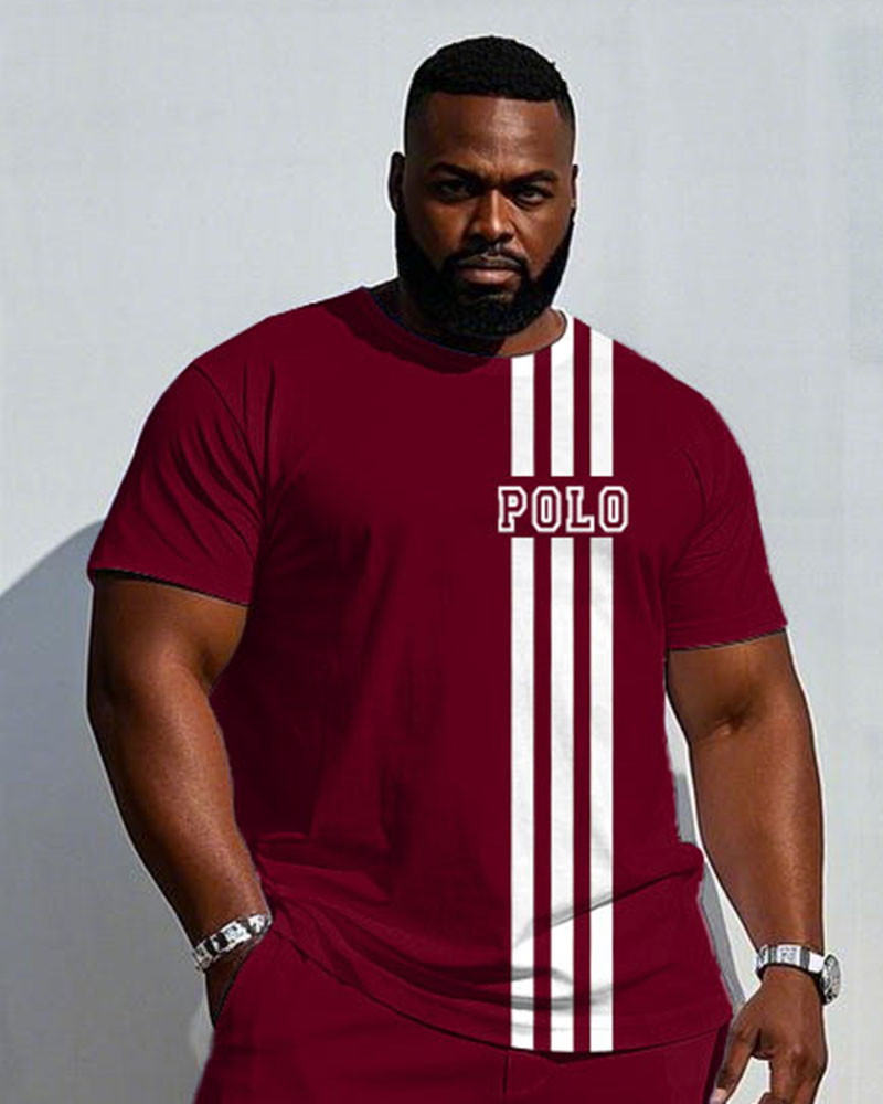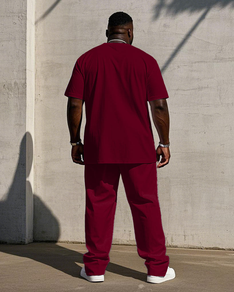 Men's Plus Size Casual Wine Red Color-block Line Chest Small Label Printed Short-sleeved T-shirt Trousers Suit