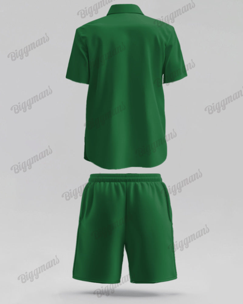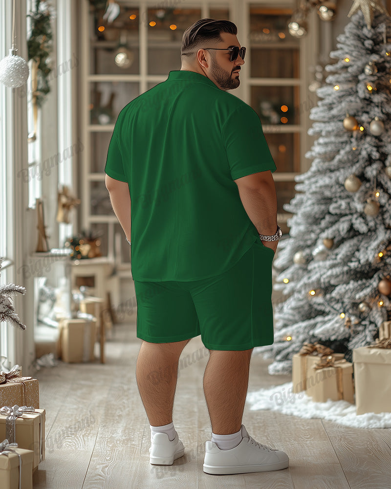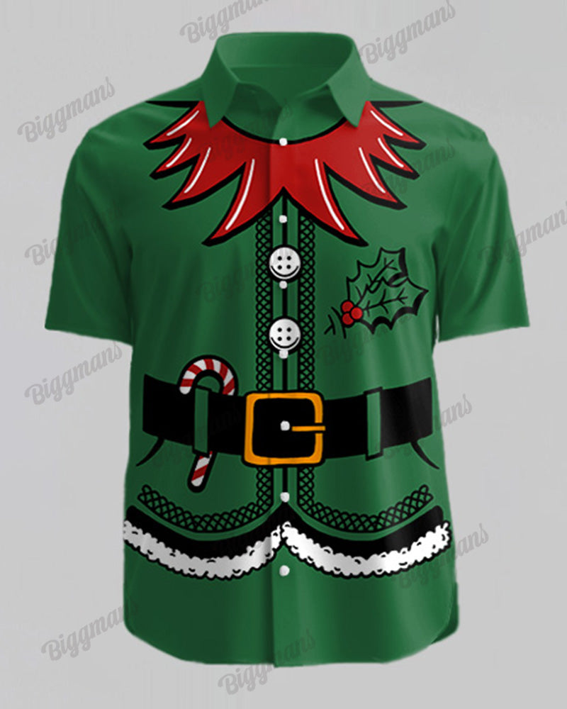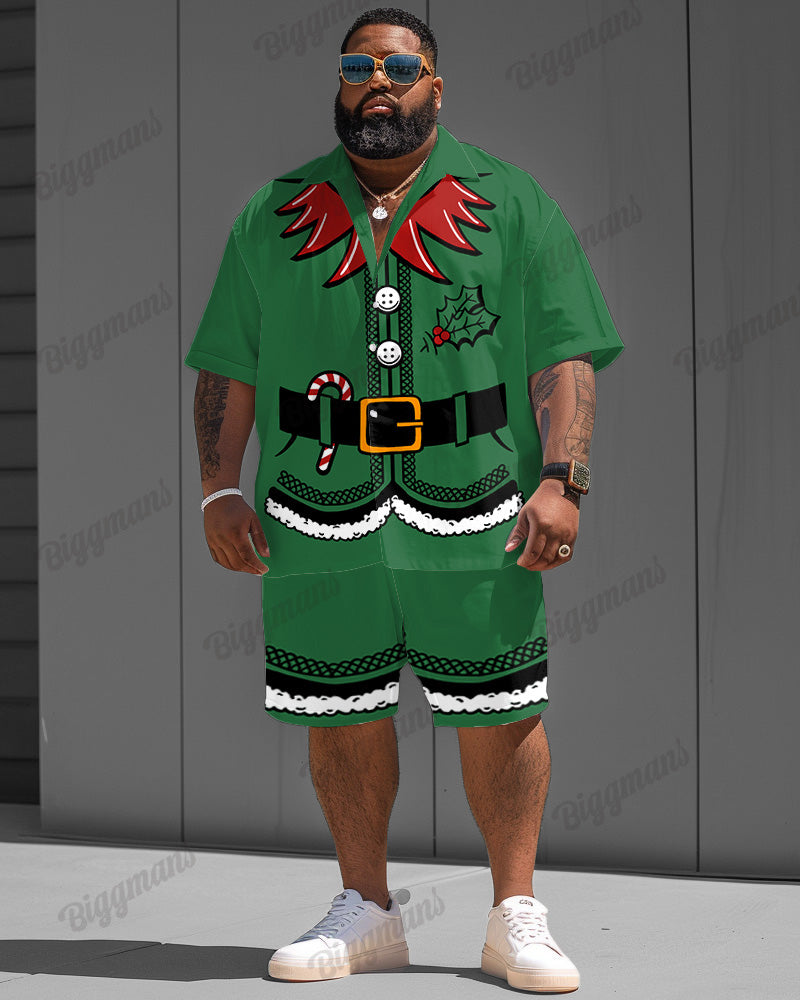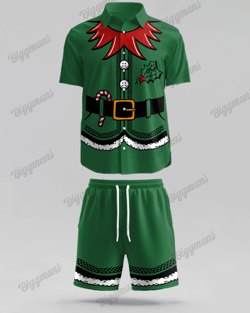 This suit is super Christmassy! The green short-sleeved shirt is dominated by a dynamic elf print, with white trim on the collar and cuffs to add a sense of sophistication. Shorts are also green, like elf magic shine, pointed hat accessories. Wear a second into a cute green elf, Christmas party must-have.