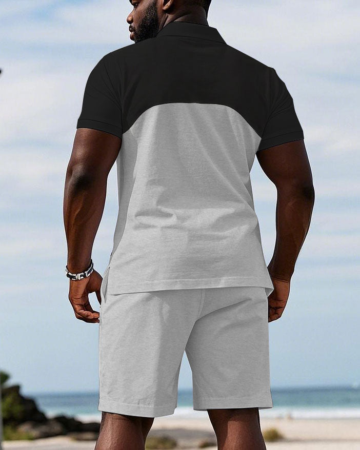 Men's Plus Size Classic Black & Light Melange Gray Design Patchwork Short Sleeve POLO Shorts Suit