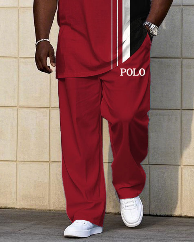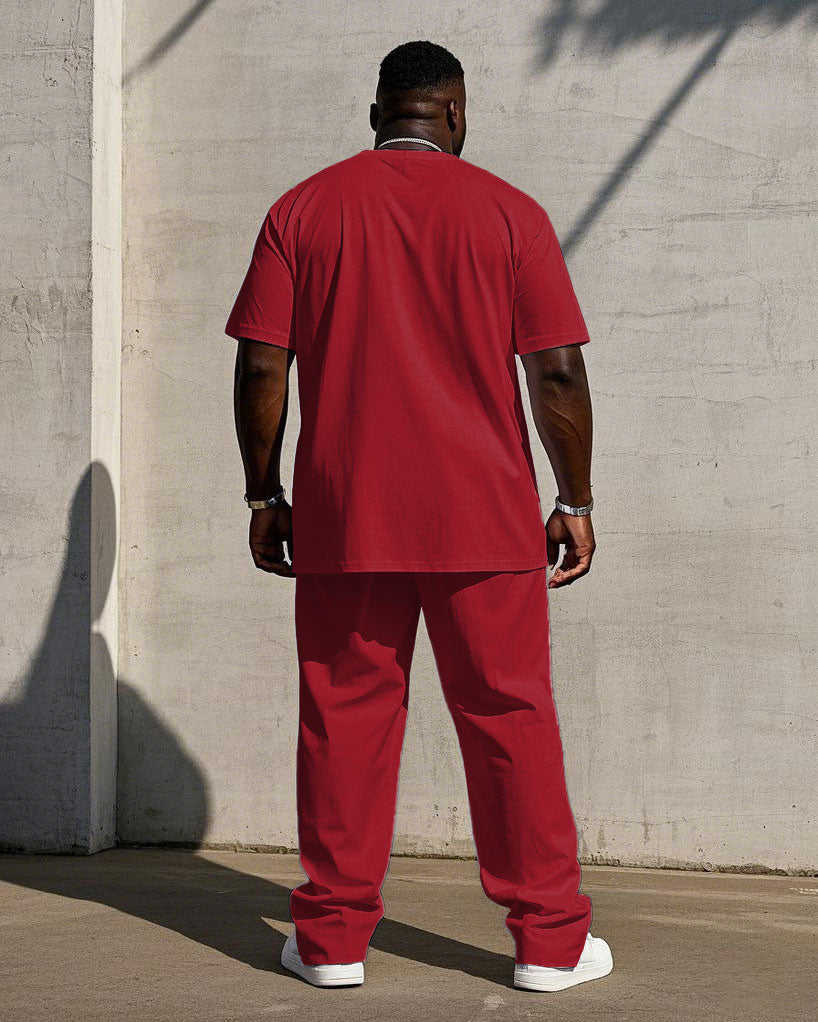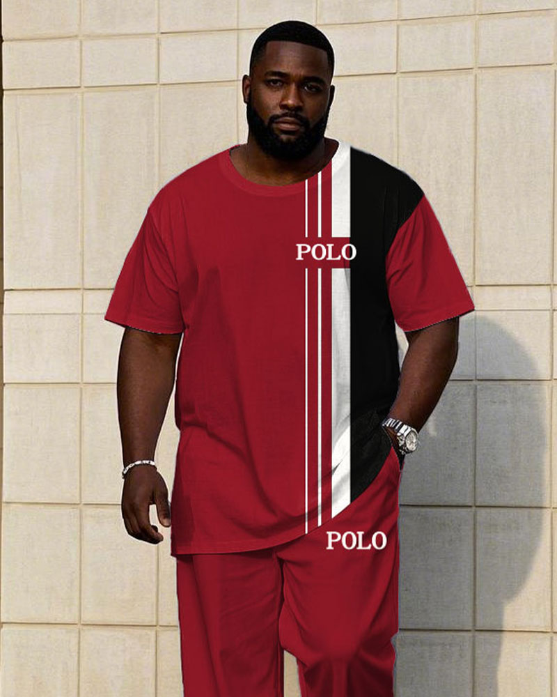 Men's Plus Size Classic Red And Black Color Chest Small Label Printed Short Sleeve T-shirt Trousers Suit
