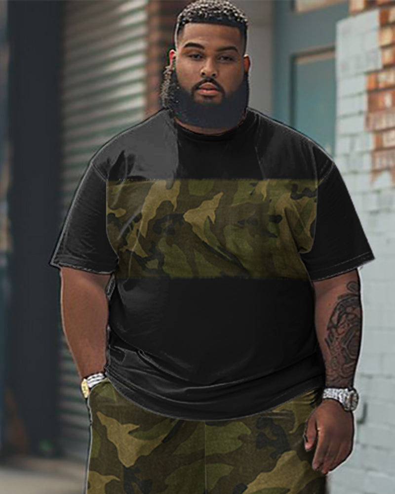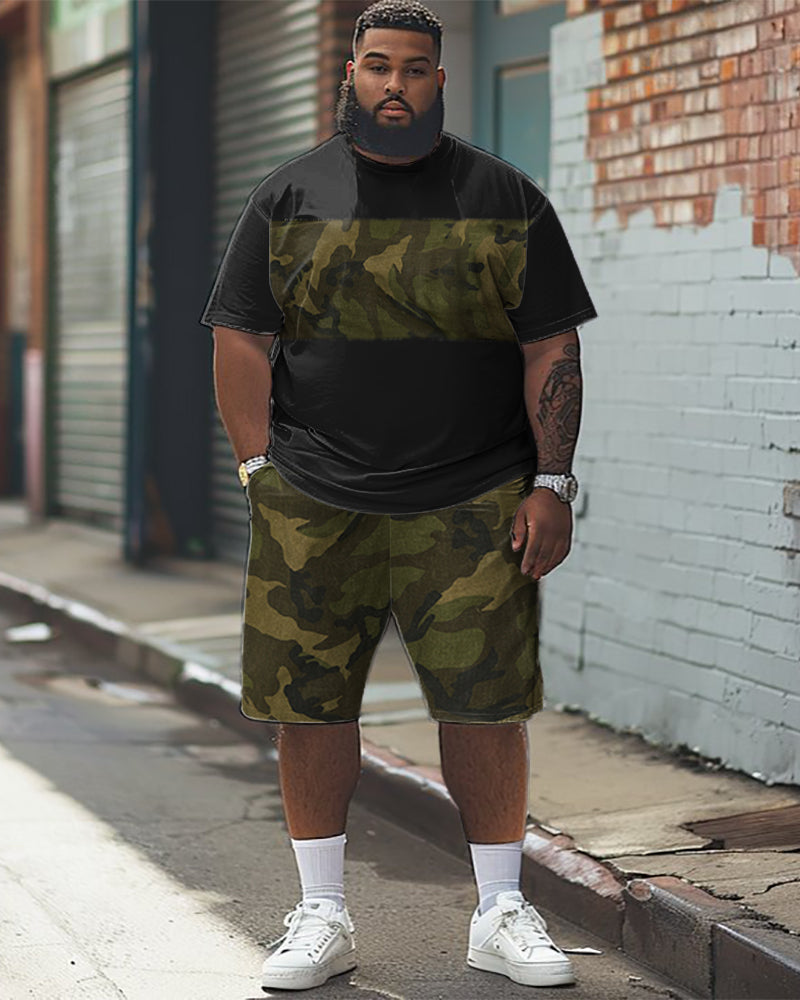 This short-sleeved T-shirt and shorts set is the perfect combination of comfort and style. The top features classic black stitching with camouflage style, while the bottom features full camouflage shorts. The loose fit allows every big man to feel comfortable and confident. It is easy to wear in spring and summer.