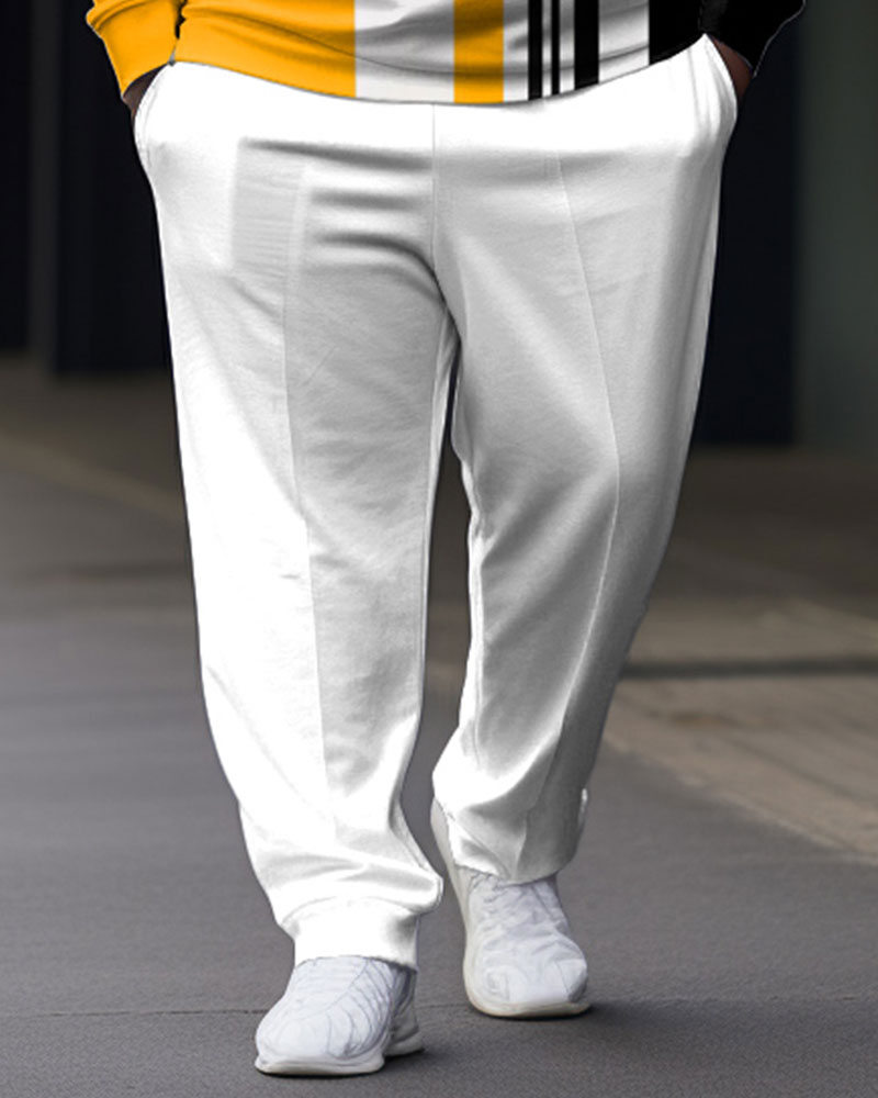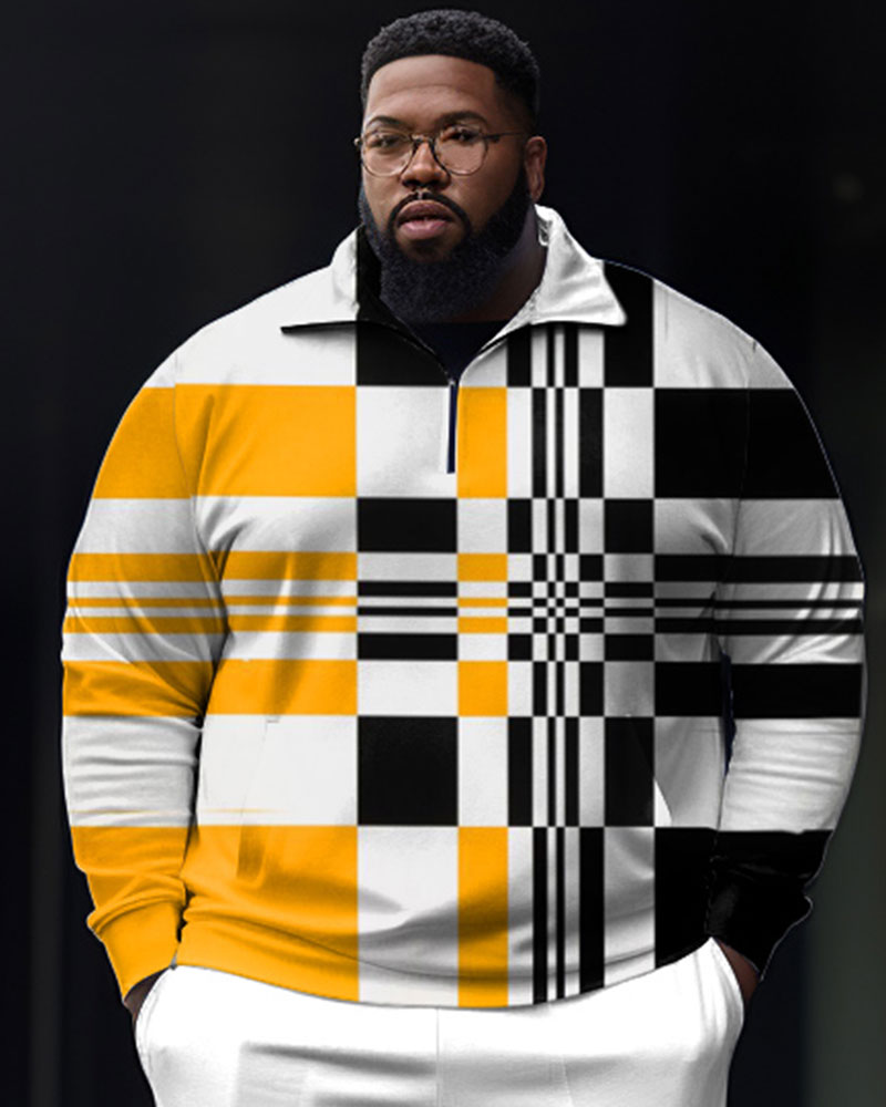 This men's big and tall two-piece set boasts a unique design. Designed for a relaxed fit, this outfit is versatile and comfy. The white theme is enhanced by a plaid design, featuring a striking mix of yellow and black check patterns. With a convenient zip collar, every detail is crafted to elevate your look.