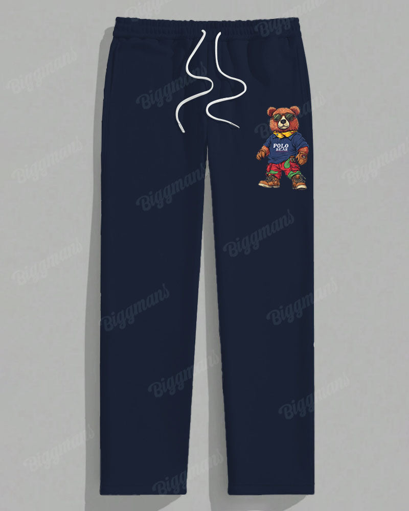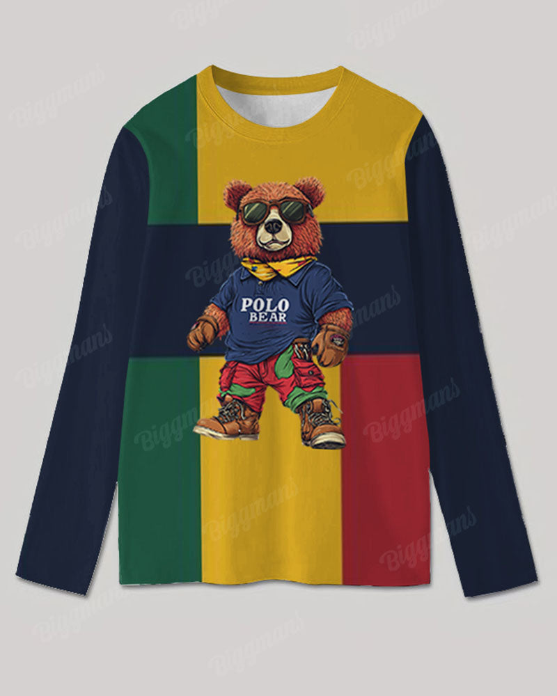 This men's plus size set consists of a long sleeve t-shirt and trousers, the t-shirt has a colour blocked stripe base with a cute bear print for a fun and vibrant look. The trousers are simple and comfortable and complement the top. The overall look is casual, yet stylish, and is designed for plus size men to meet the demands of everyday wear.