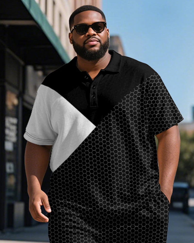 Men's Plus Size Daily Black And White Patchwork Printed Short-sleeved Polo Shirt Shorts Suit