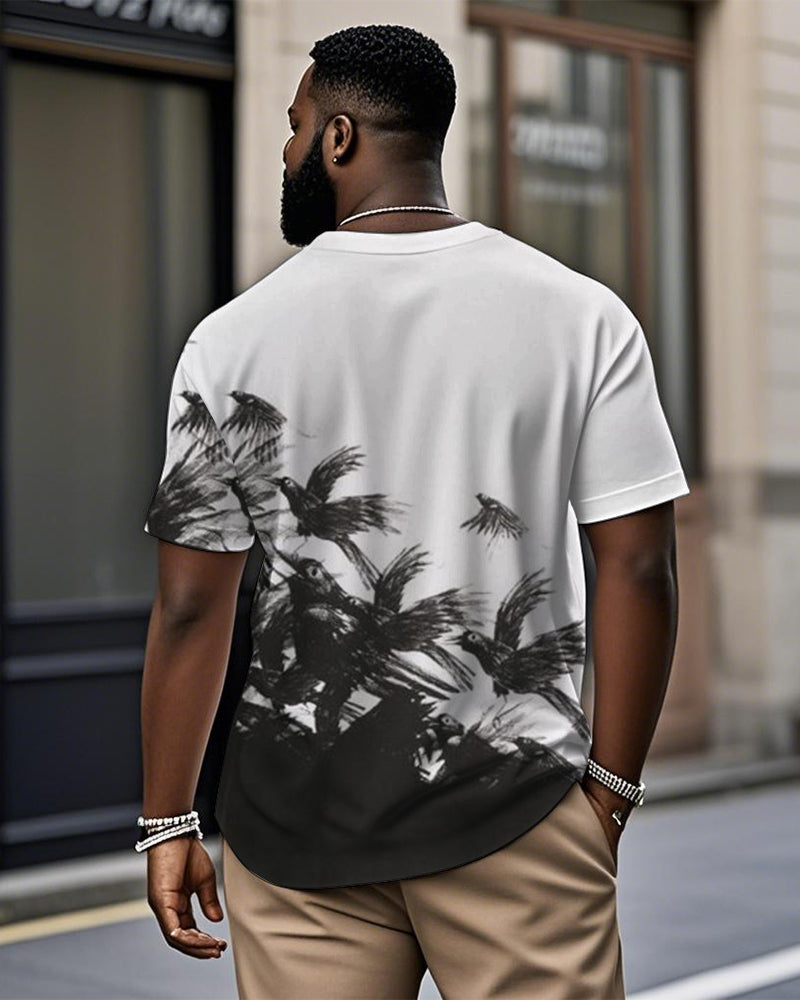 Men's Plus Size Daily Casual Black And White Bird Print Henry Collar Button Short Sleeve T-Shirt