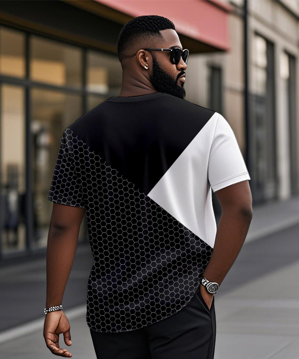 Men's Plus Size Daily Casual Black And White Patchwork Geometric Print Henry Collar Button Short Sleeve T-Shirt
