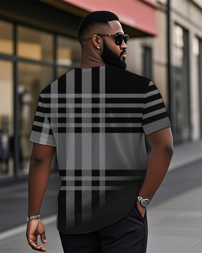 Men's Plus Size Daily Casual Black Plaid Letter Print Henry Collar Button Short Sleeve T-Shirt