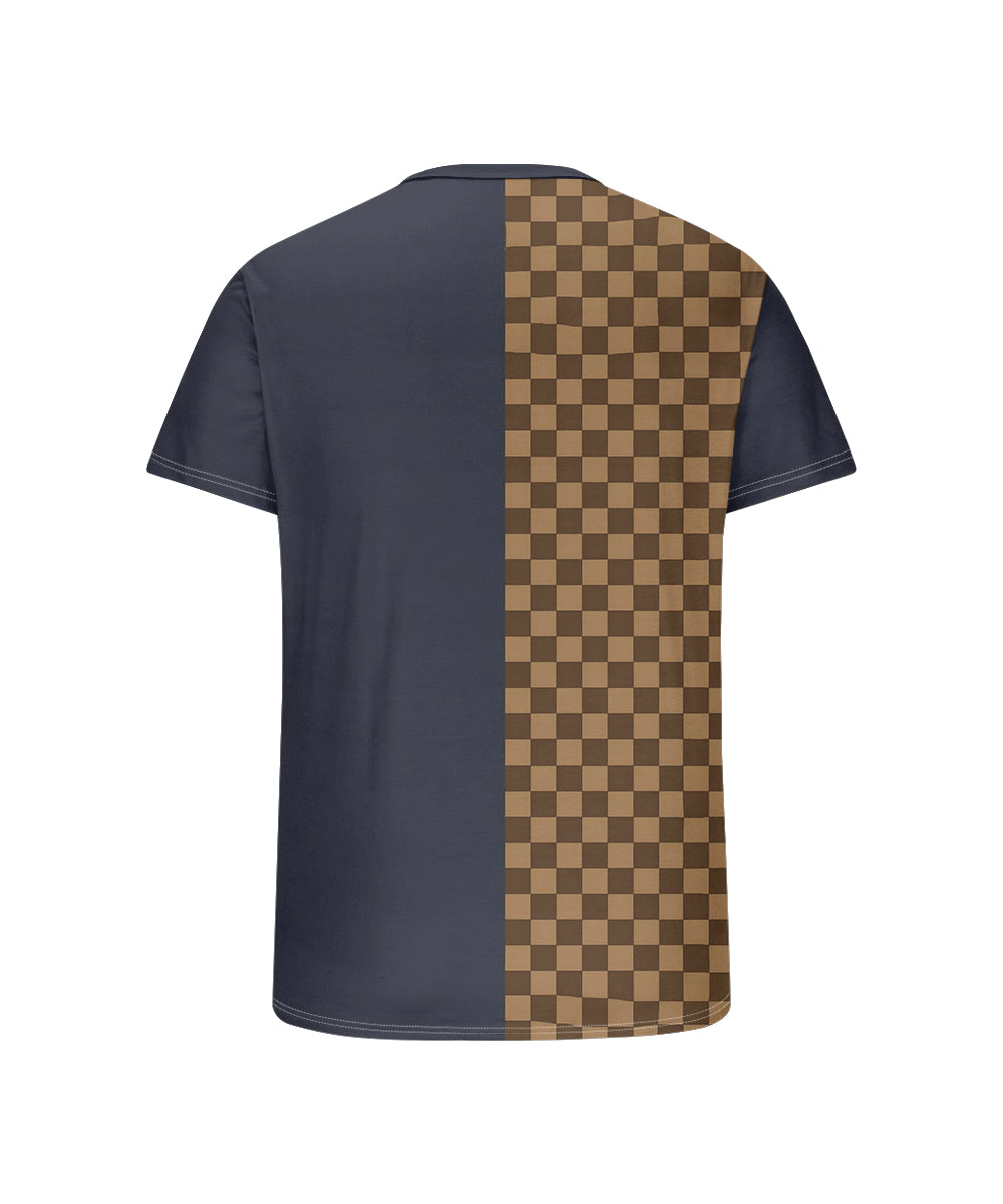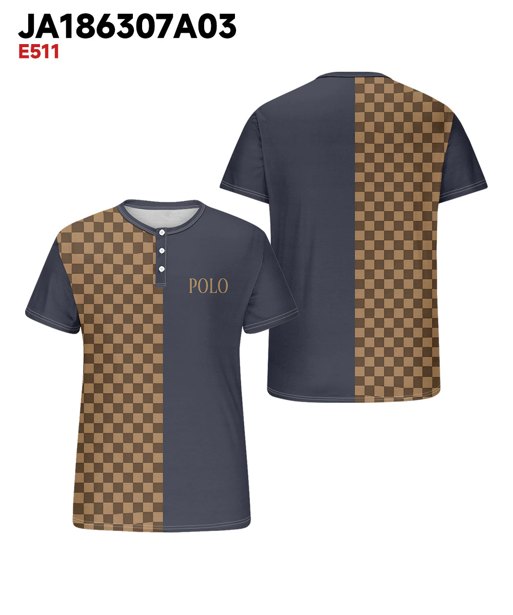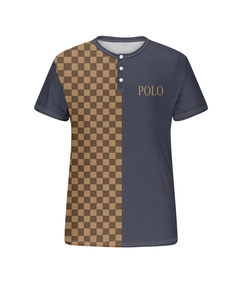 Men's Plus Size Daily Casual Blue Stitching Brown Plaid Letter Print Henry Collar Button Short Sleeve T-Shirt