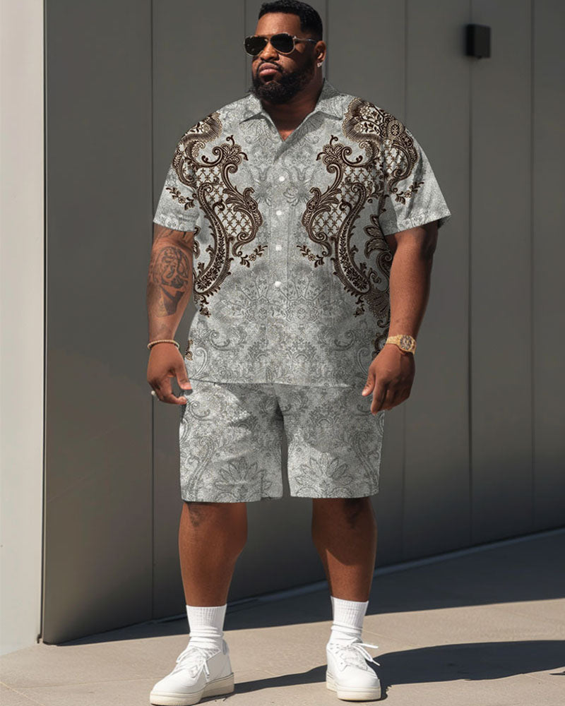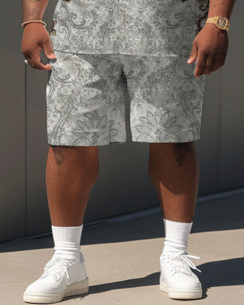 Men's Plus Size Daily Casual Simple Grey Retro Geometric Full Print Shirt Shorts Suit