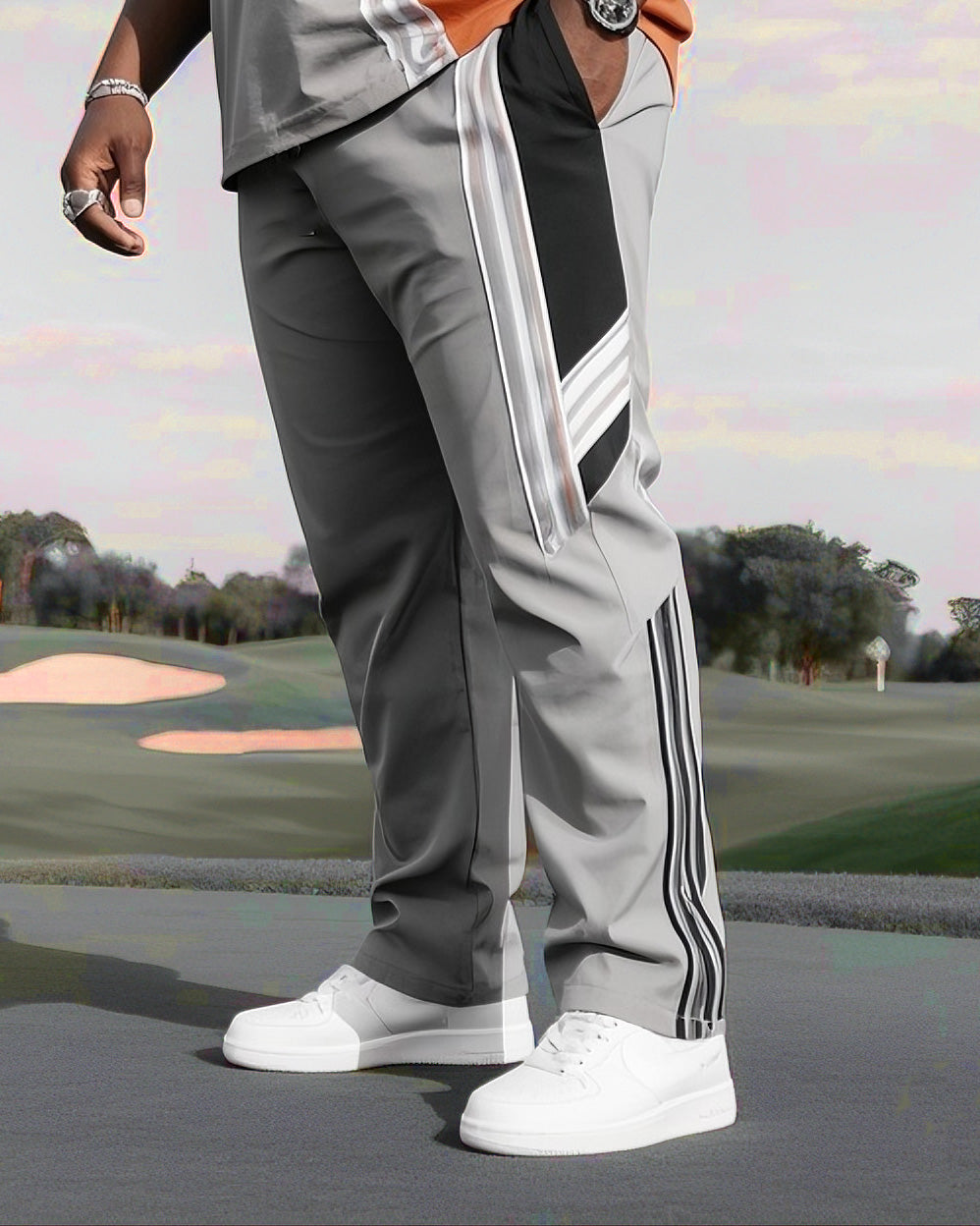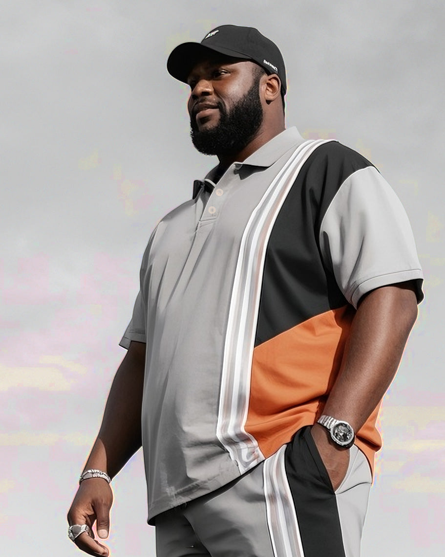 Men's Plus Size Daily Casual Simple Slant Striped Gray Short Sleeve POLO Trousers Suit