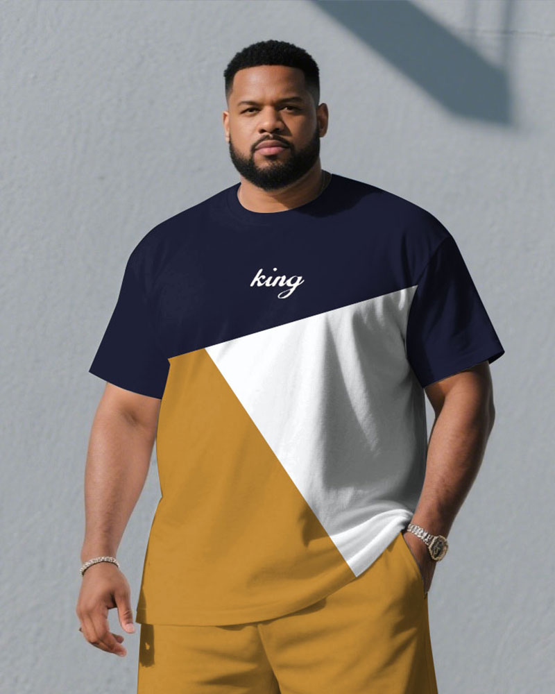 Men's Plus Size Dark Blue & Yellow & White Fashion Round Neck Short Sleeve T-Shirt Shorts Suit