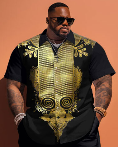Upgrade your style with this short set for big men. Crafted in classic black with intricate gold ethnic prints, this set blends timeless elegance with a modern twist. The loose fit offers all-day comfort. Ideal for casual summer days, the rich detailing adds a touch of sophistication.