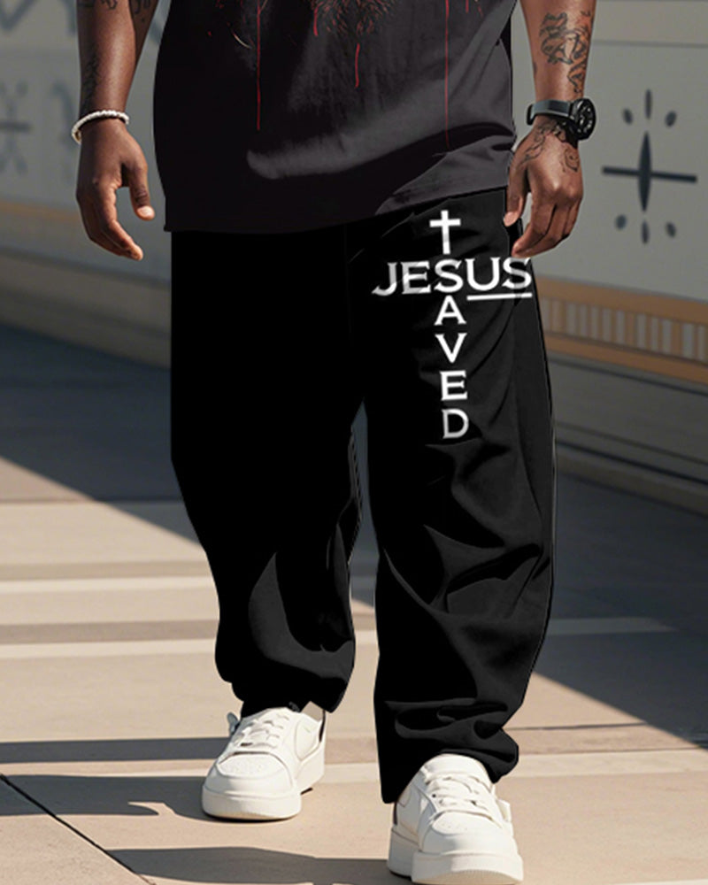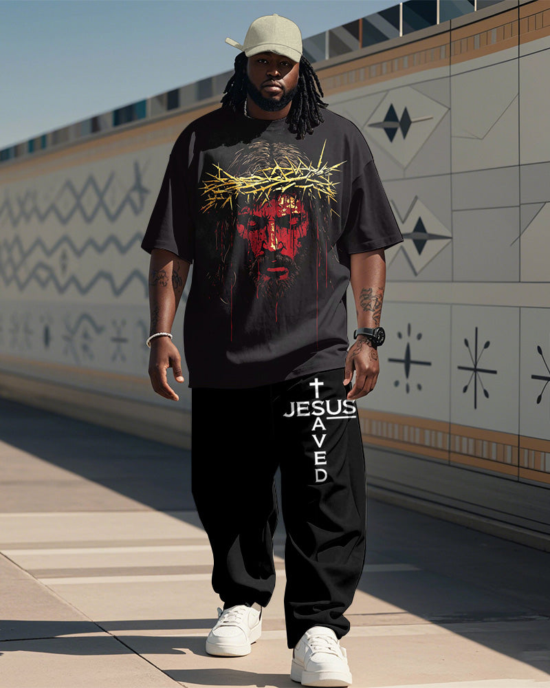 This men's plus size suit is designed for the man of character, with an eye-catching and unique graffiti print of Jesus on the T-shirt, conveying a different spiritual connotation and a strong sense of art. Matching trousers with the same style, the loose fit is comfortable and the overall style is casual and uninhibited, whether it is for daily travelling or social gatherings, it can show the wearer's attitude of spontaneity.