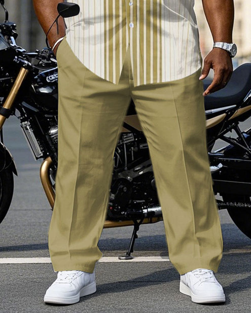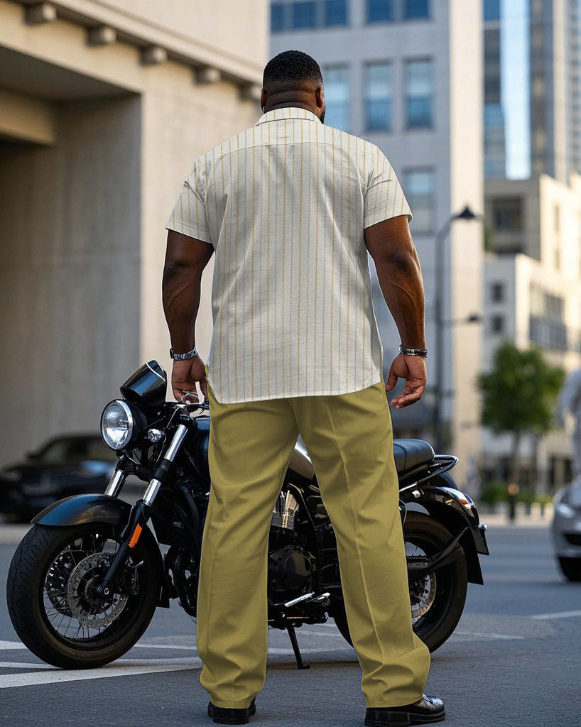 Men's Plus Size Fashion Apricot Striped & Yellow Striped Patchwork Short Sleeve Shirt Pants Suit