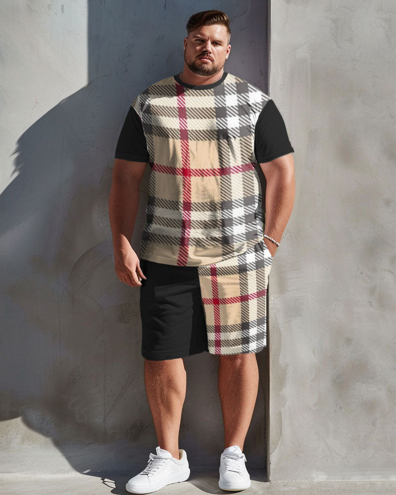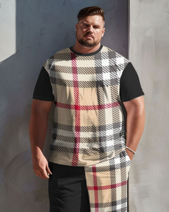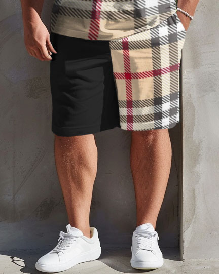 This men's two-piece set is ideal for summer. It features a unique khaki and black color block design, making it a modern and versatile piece that can be dressed up or down for any occasion. The classic design is perfect for standing out from the crowd and embracing a contemporary look.