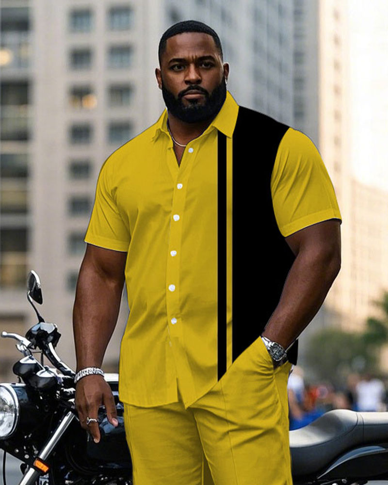Men's Plus Size Fashion Yellow & Black Simple Short Sleeve Shirt Pants Suit
