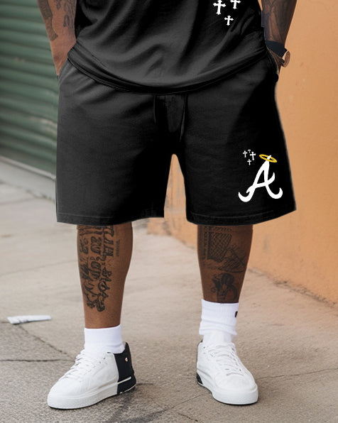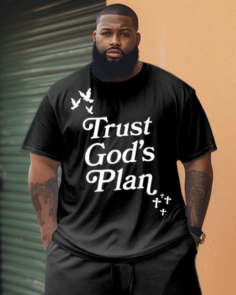 This men's two-piece set features a simple black design. The "TRUST GOD'S PLAN" artistic font print shows a unique sense of street fashion. The overall style is simple yet individual. Multiple size options make it easier for big men to fit. With various matching methods, this set is suitable for various occasions, making it an ideal choice for street fashion.
