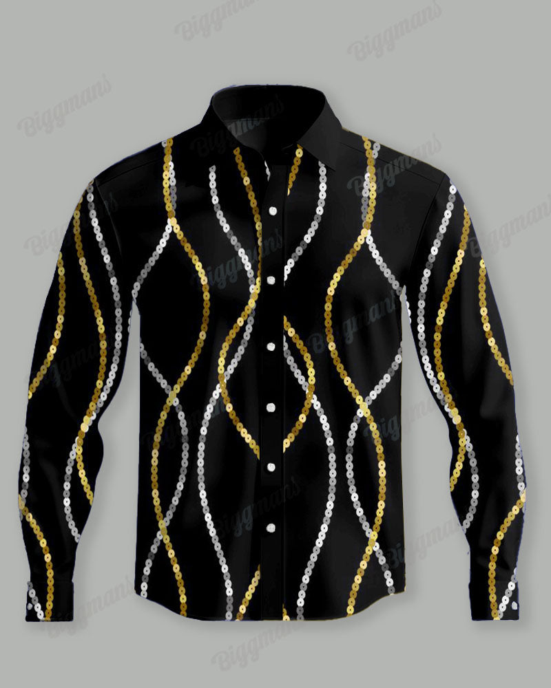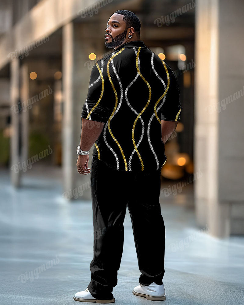 The men's plus size suit features a gold and silver color blocking for a sparkling and eye-catching look. Glitter prints all over the long sleeve shirt and pants create a luxurious yet chic vibe. The shirt is exquisitely tailored with elegant long sleeves and the pants have a loose fit that combines comfort and personality, allowing men to be the center of attention and look unique in all occasions.