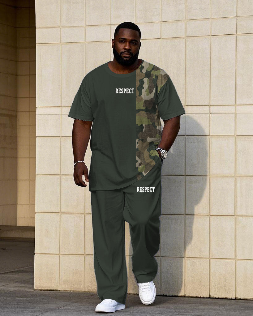 Men's Plus Size Gray Green & Camouflage Chest "Respect" Slogan Printed Short Sleeve T-Shirt Trousers Suit