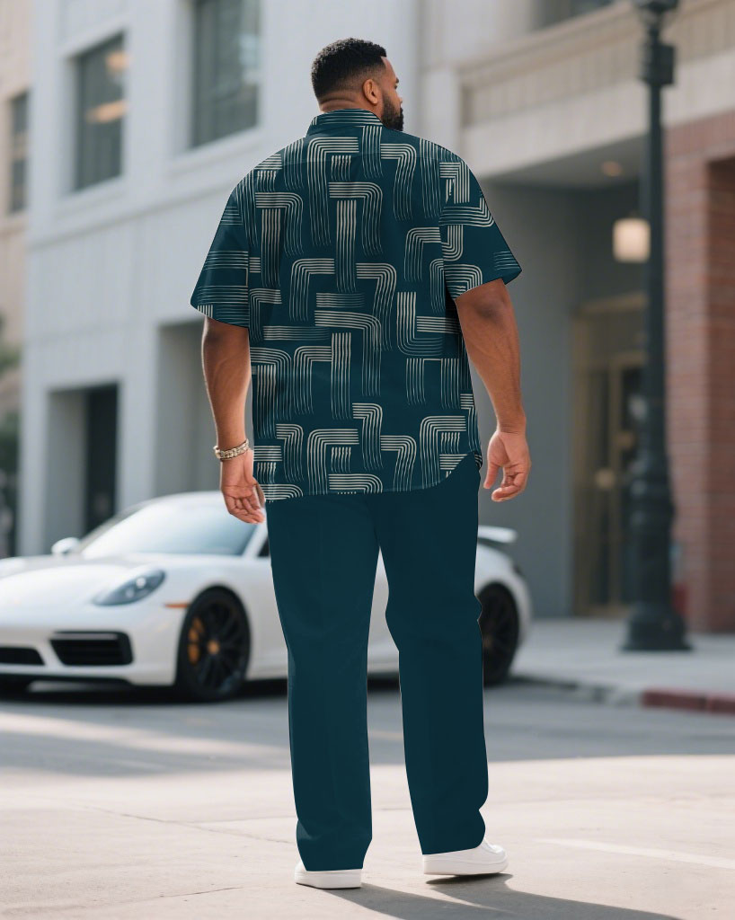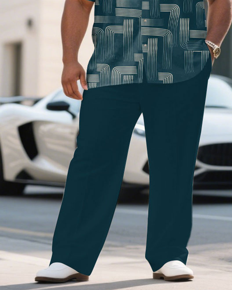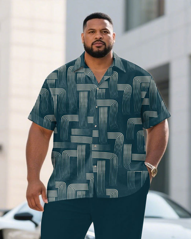 Men's Plus Size Green Business Irregular Linear Short Sleeve Shirt Pants Suit
