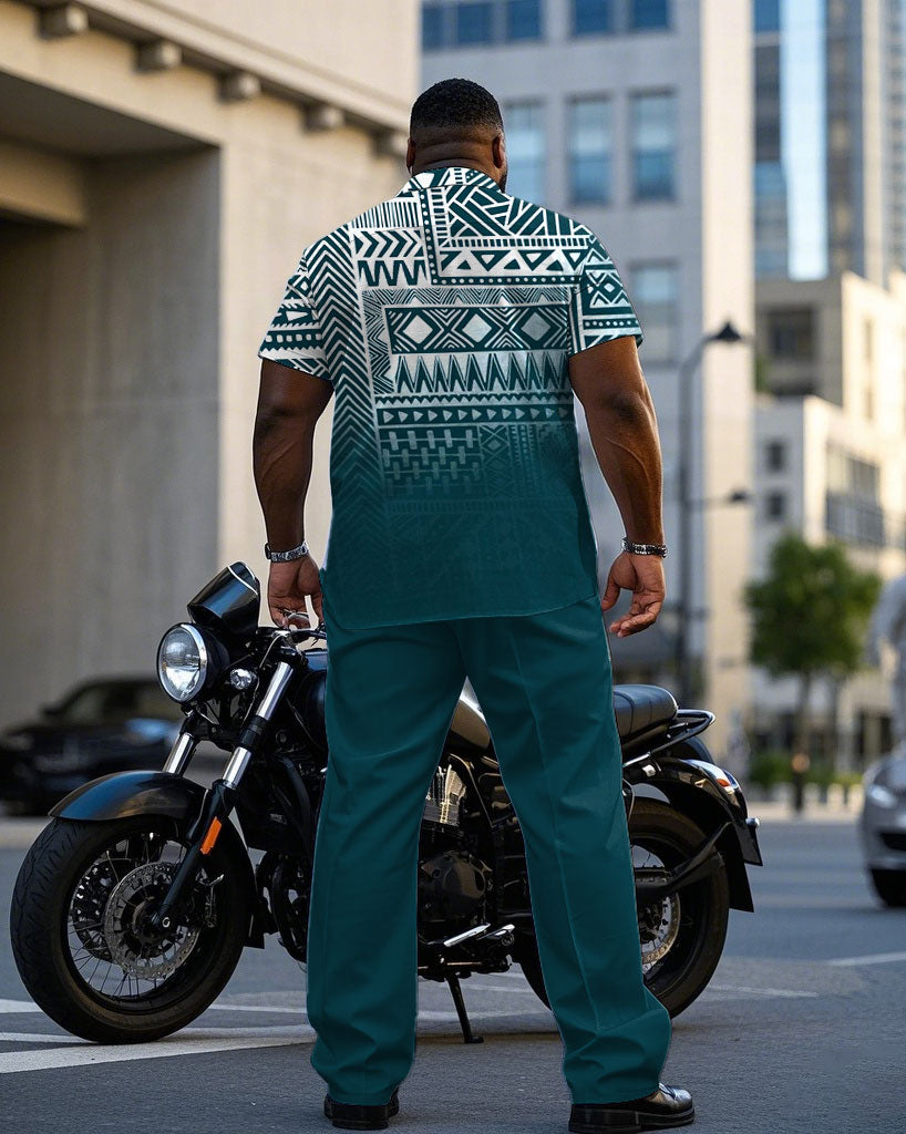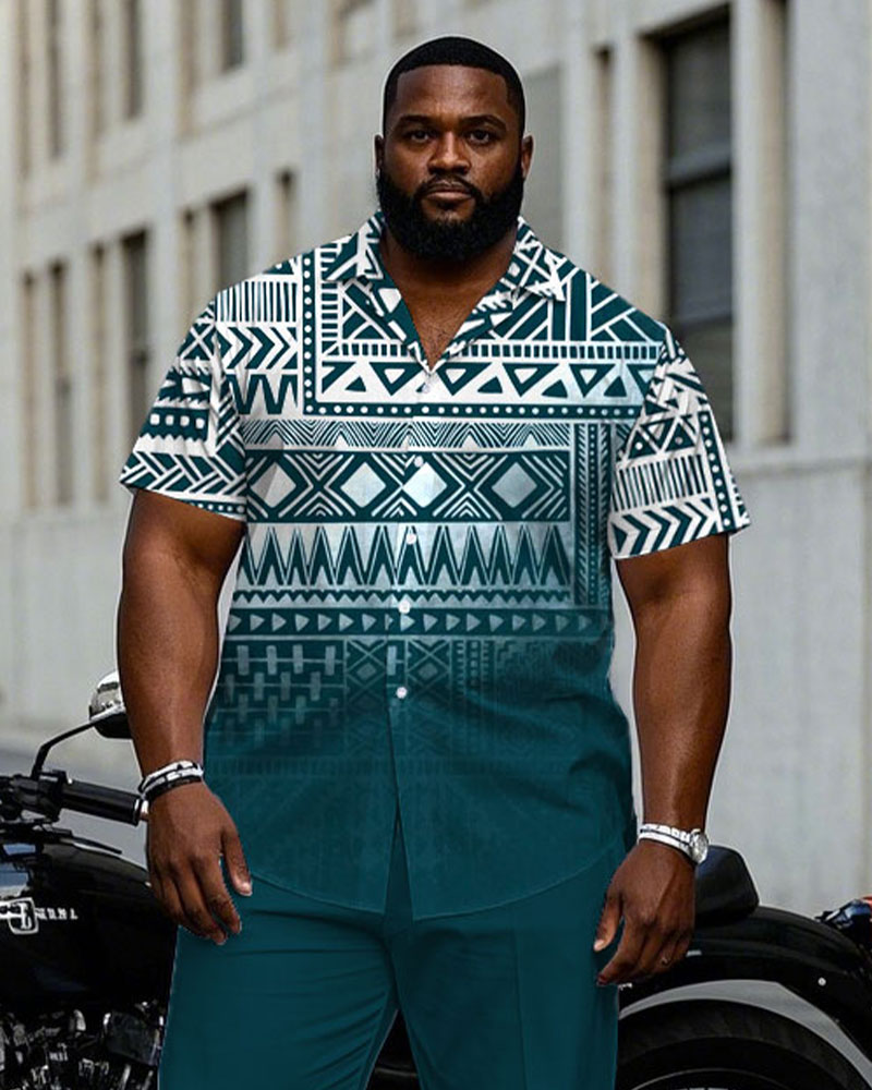 Men's Plus Size Green Gradient Ethnic Pattern Short Sleeve Shirt Trousers Suit
