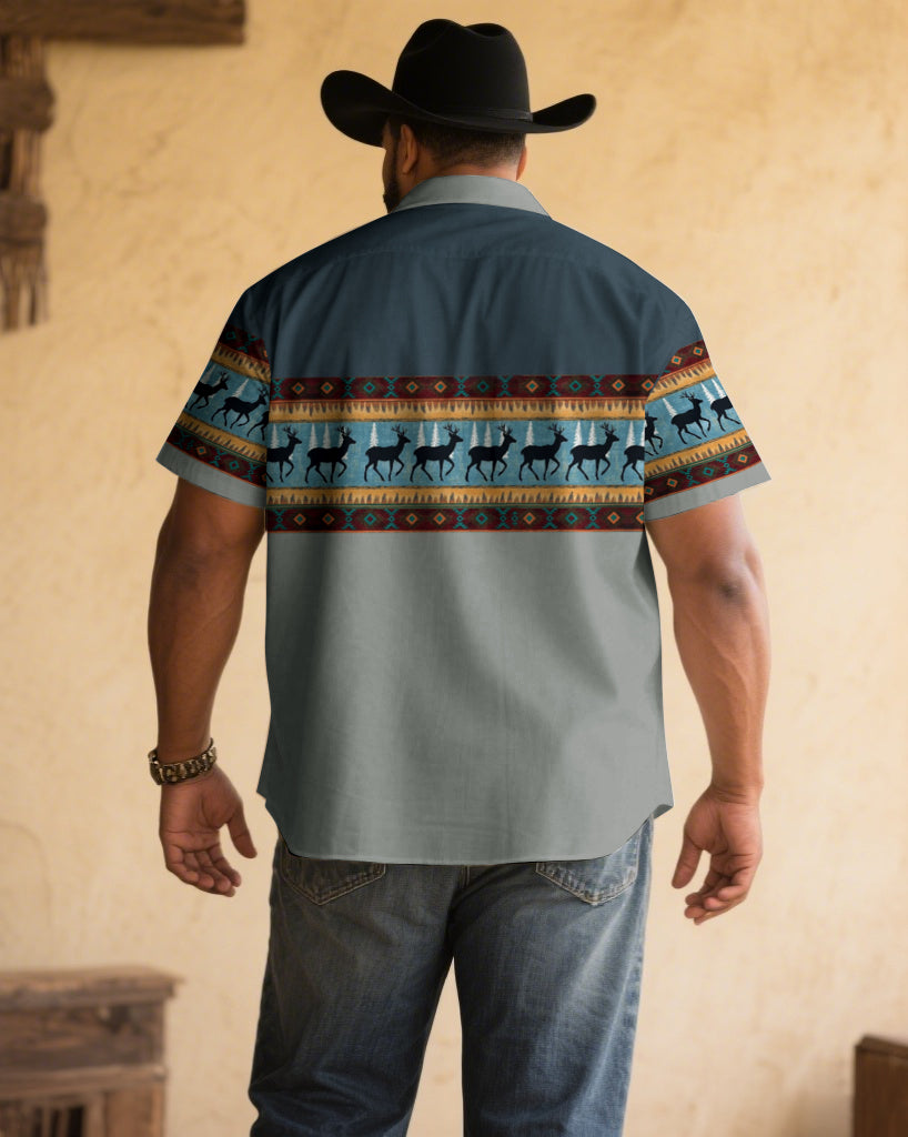 Men's Plus Size Grey & Blue Elk-Print Short Sleeve Shirt
