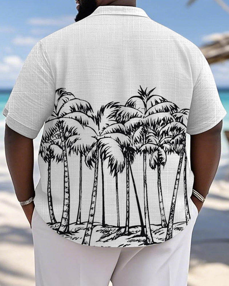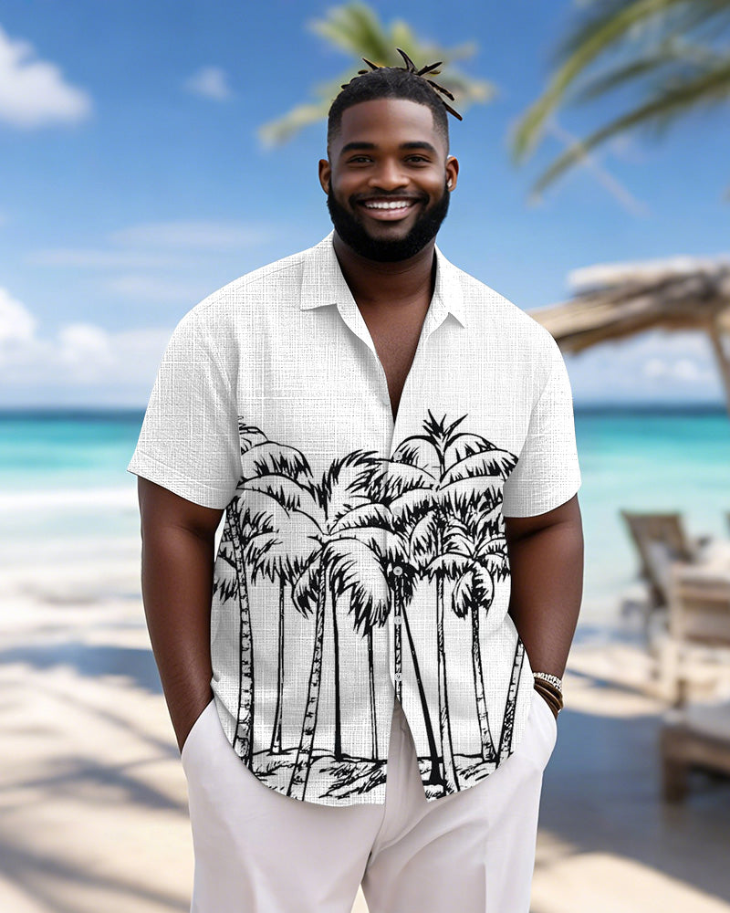 Men's Plus Size Hawaiian Black And White Coconut Printed Short Sleeve Slub Shirt