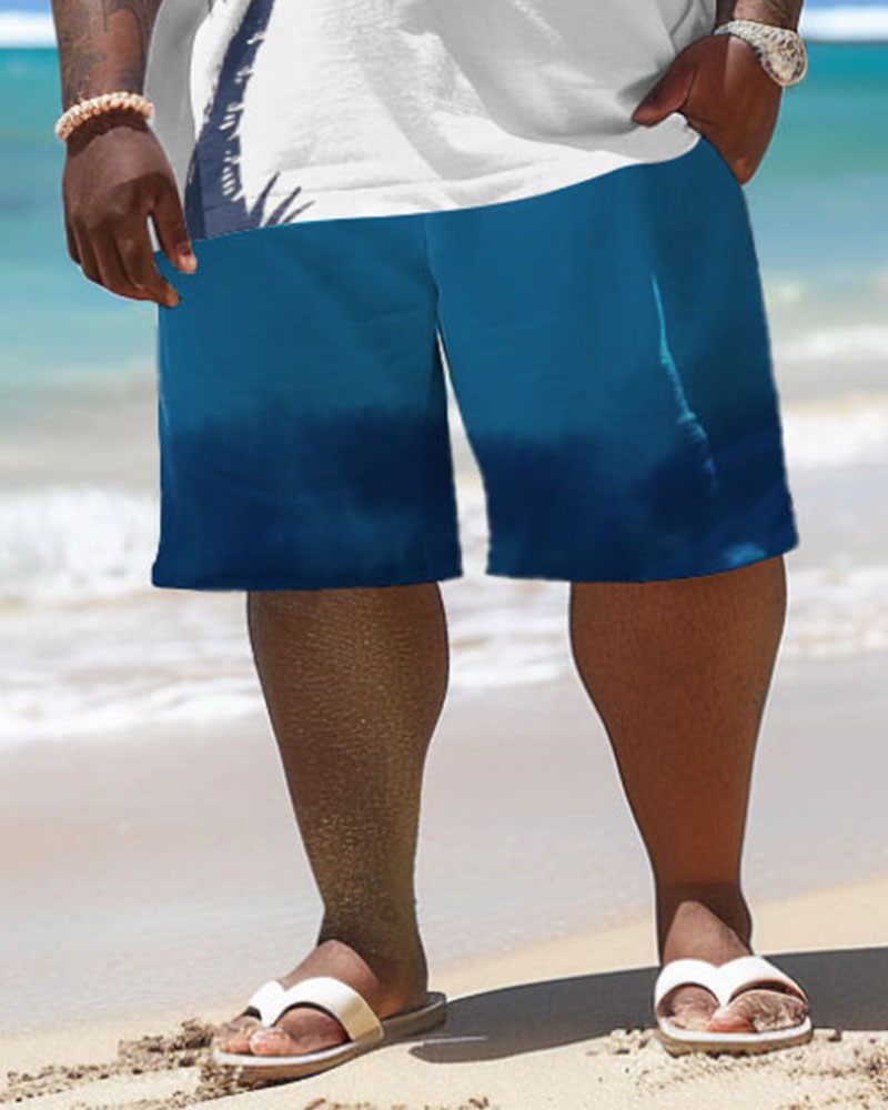This big guy's shorts set allows you to enjoy the . The white T-shirt is printed with coconut trees and artistic letters, exuding a Hawaiian style, and the blue gradient shorts add a touch of coolness. The loose version is ideal for your summer vacation wardrobe.