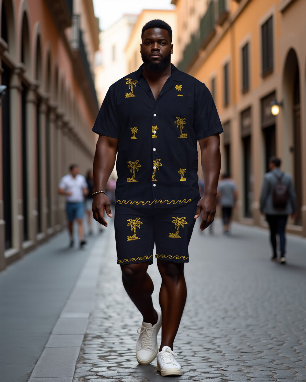 Men's Plus Size Hawaiian Fluorescent Black Coconut Casual Cuban Collar Short Sleeve Shirt Shorts Suit