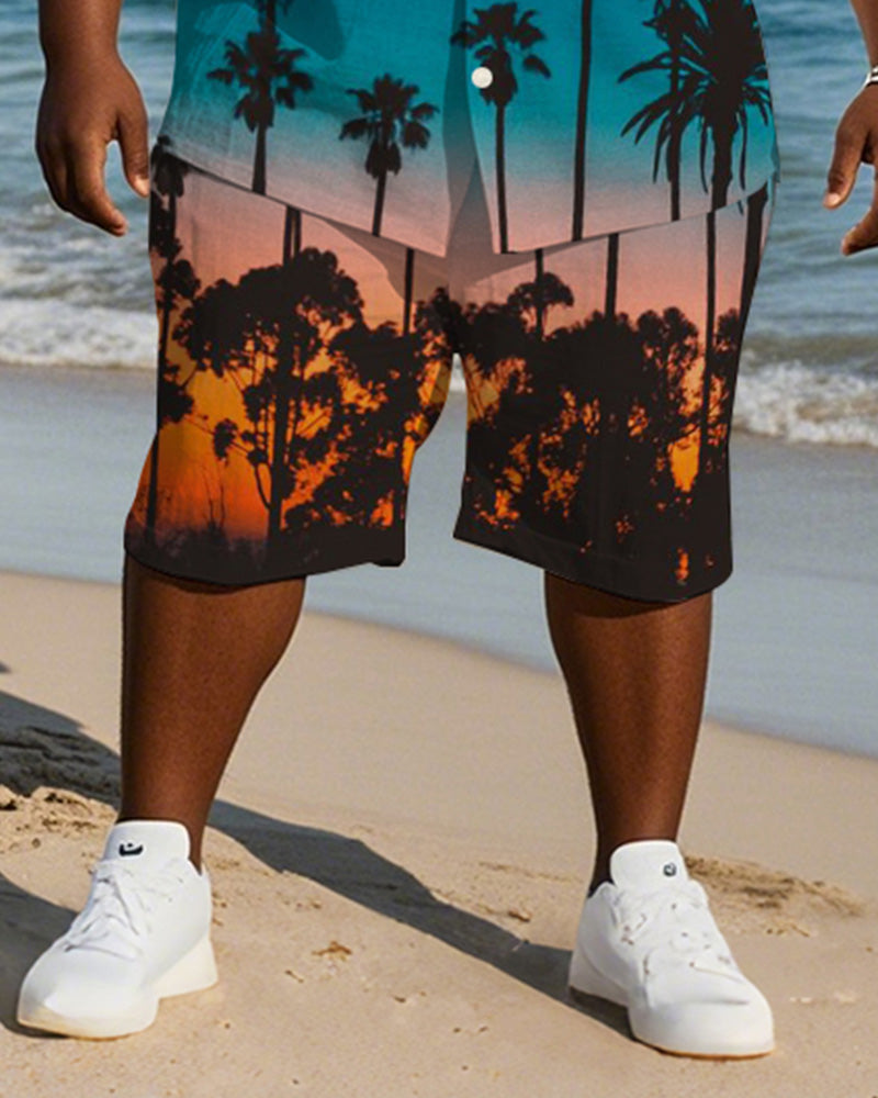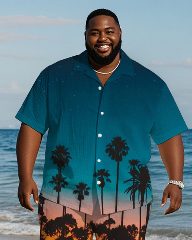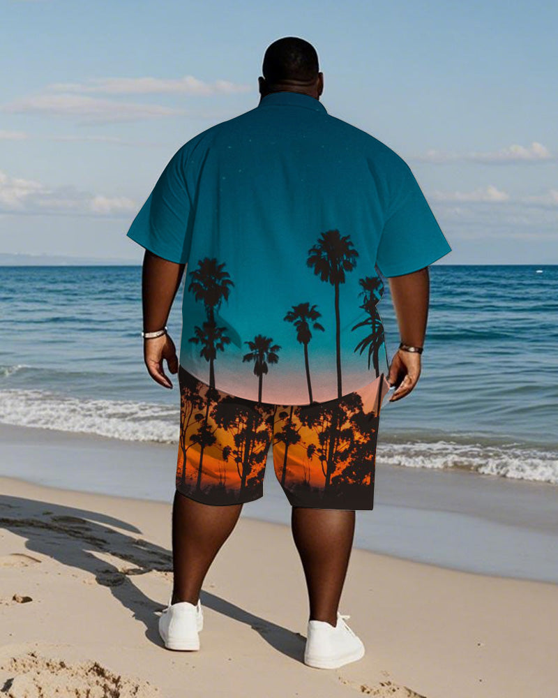 Men's Plus Size Hawaiian Gradient Blue Coconut Tree Print Shirt Shorts Suit