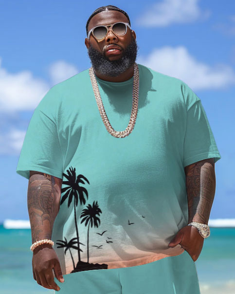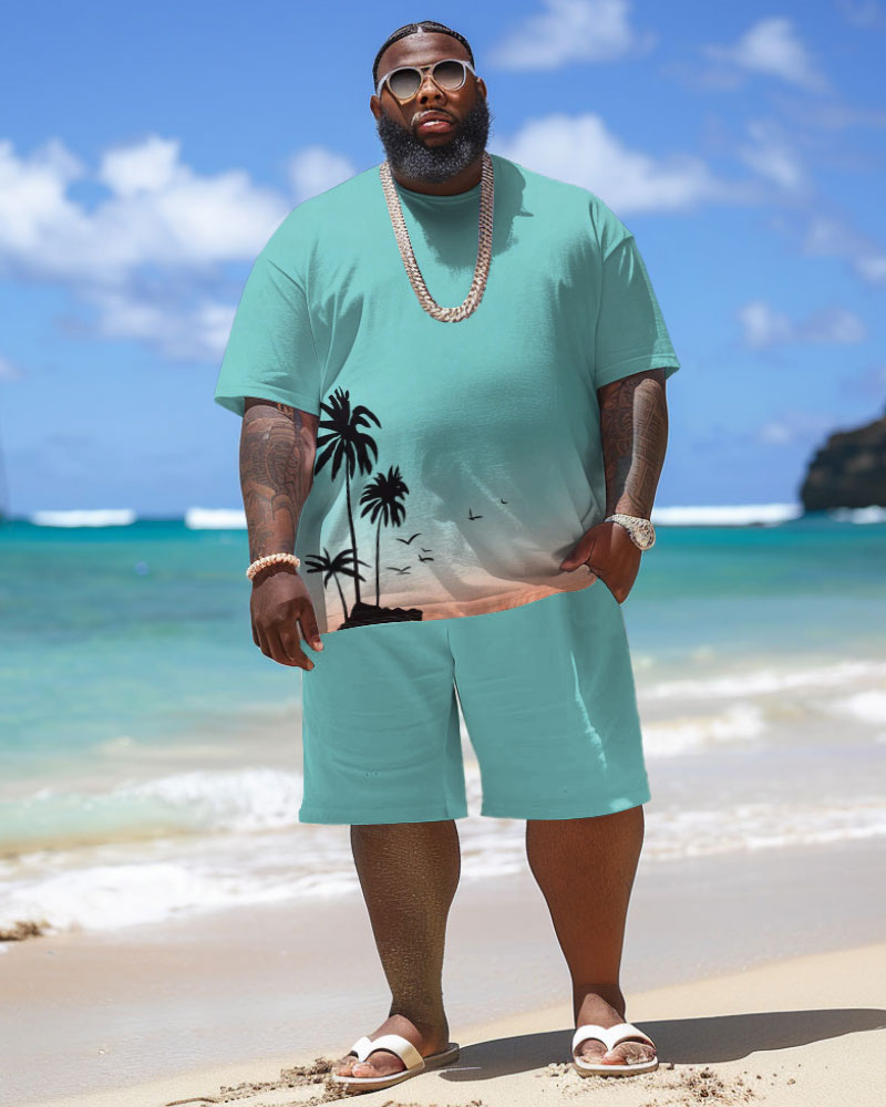 For your next travel, why not try the special Hawaiian style? This two-piece set features a green-to-pink . Printed with coconut tree prints, it captures the essence of laid-back tropical vibes. This ensemble embodies street fashion, which is your go-to for casual summer fun.