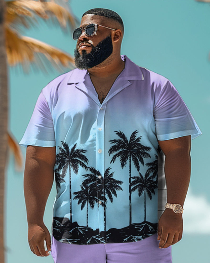 This vibrantly embodies summer island charm. Featuring a gradient of blue-purple hues, it's adorned with black coconut tree prints. Perfect for summer, it captures the essence of tropical getaways. So, make a fashionable statement with this chic and comfortable ensemble.