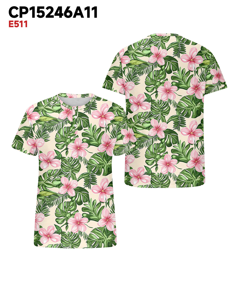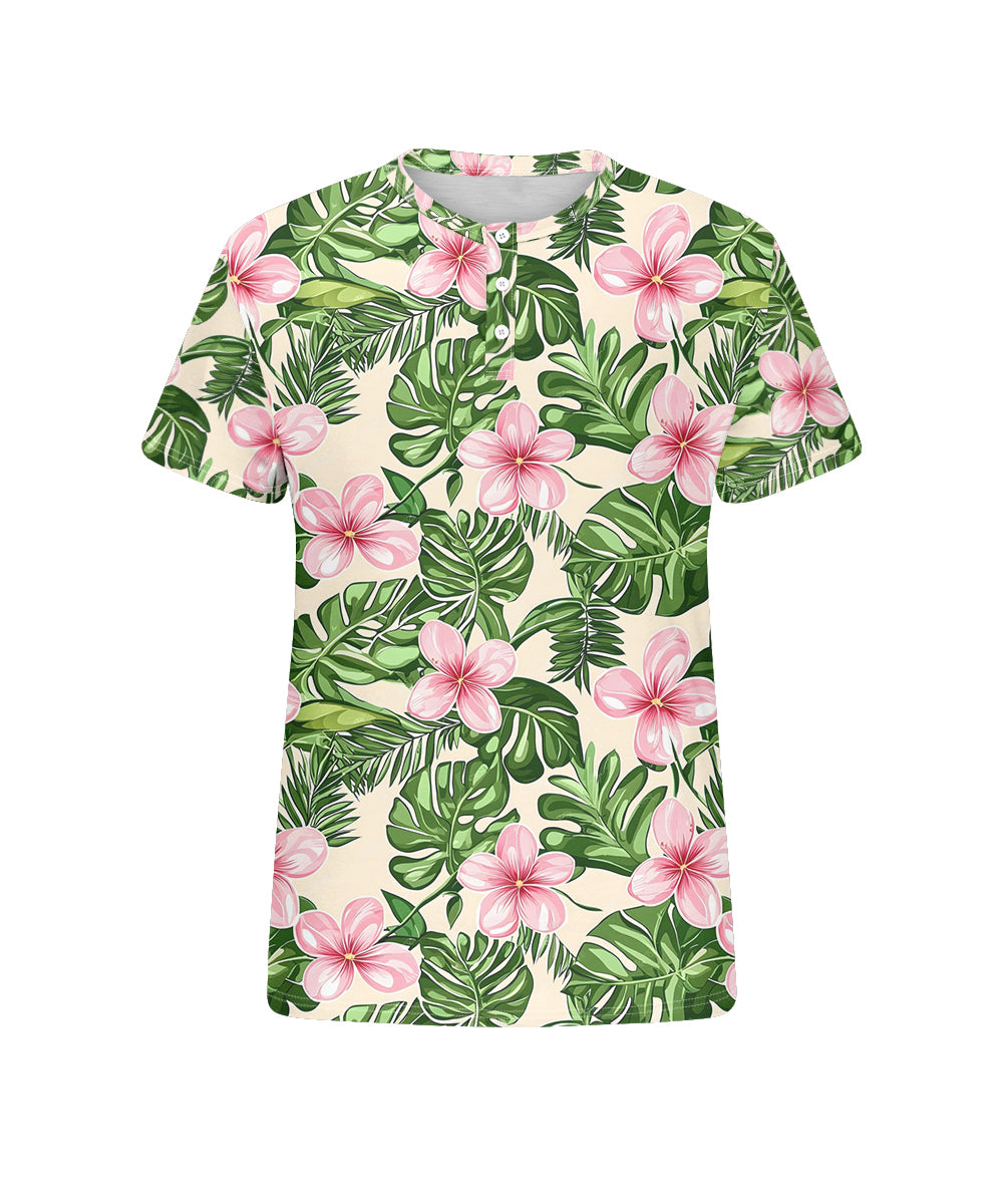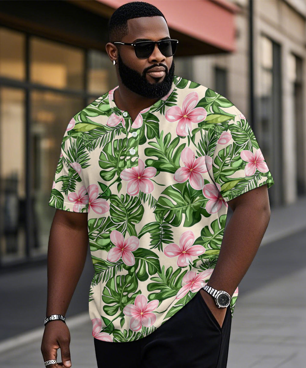 Men's Plus Size Hawaiian Green Floral Print Henry Collar Button Short Sleeve Tee