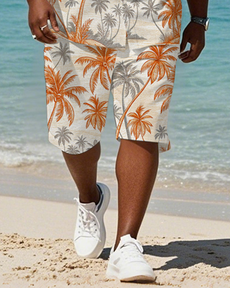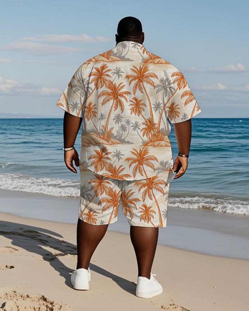 Men's Plus Size Hawaiian Hand Painted Orange Grey Coconut Tree Print Shirt Shorts Suit