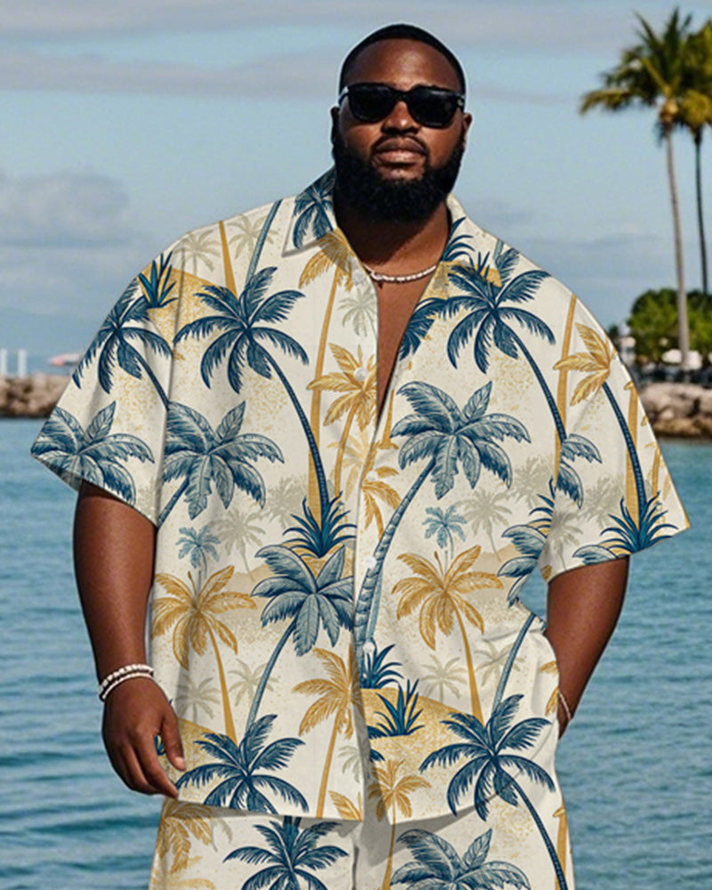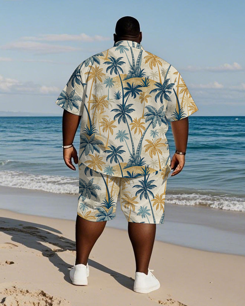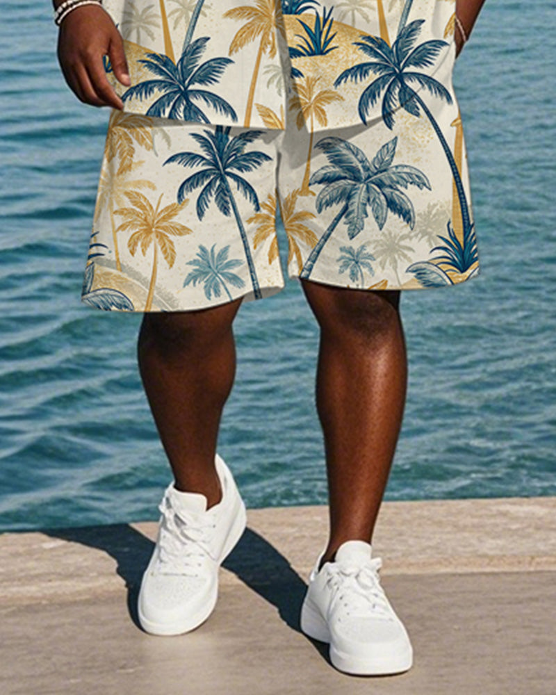 Men's Plus Size Hawaiian Hand Painted Yellow Blue Coconut Tree Print Shirt Shorts Suit