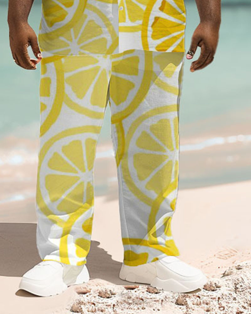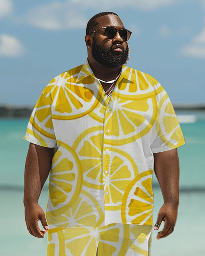 Embrace a refreshing vibe with this men's big & tall Hawaiian short-sleeve T-shirt set, featuring a vibrant lemon slice print. This set keeps you cool with breathable poly-blend fabric during those hot summer days. The relaxed fit makes it versatile for various occasions, from casual outings to beachside strolls.