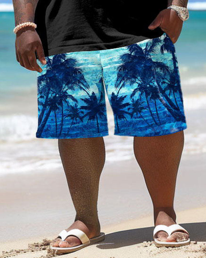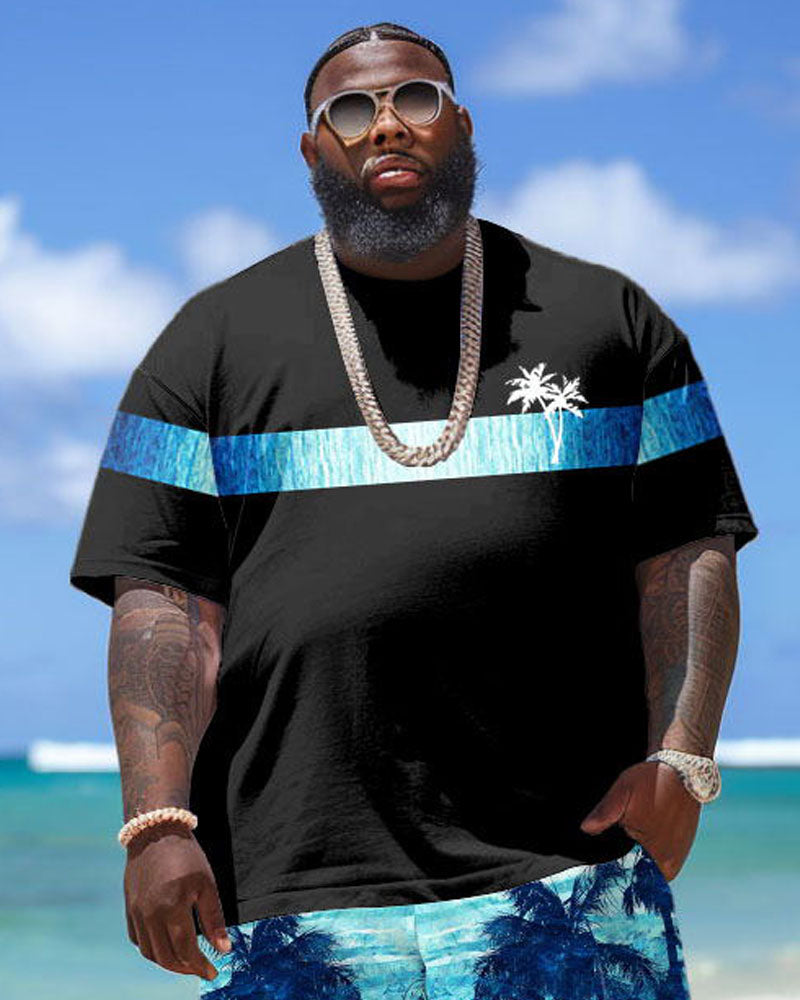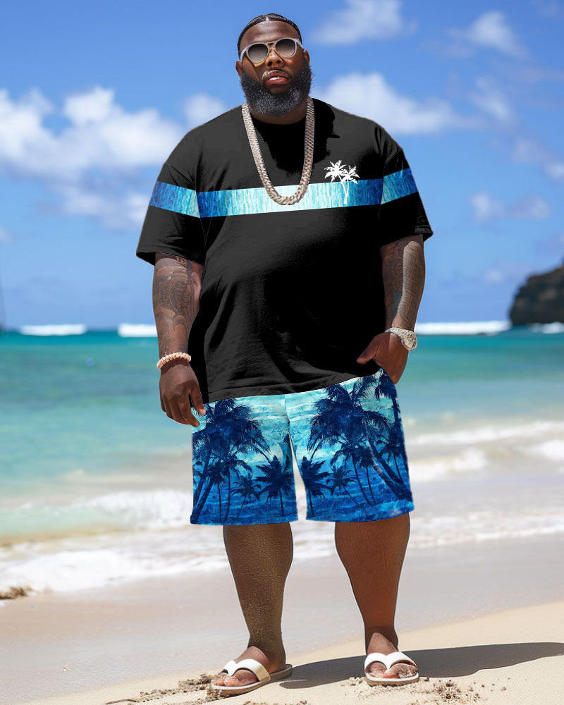 Enjoy the blue of the ocean! This two-piece set for big & tall men combines blue-and-black color blocking with coconut tree prints. The relaxed fit ensures freedom and comfort. No matter what leisure activities, this set will keep you cool and stylish on hot summer days!