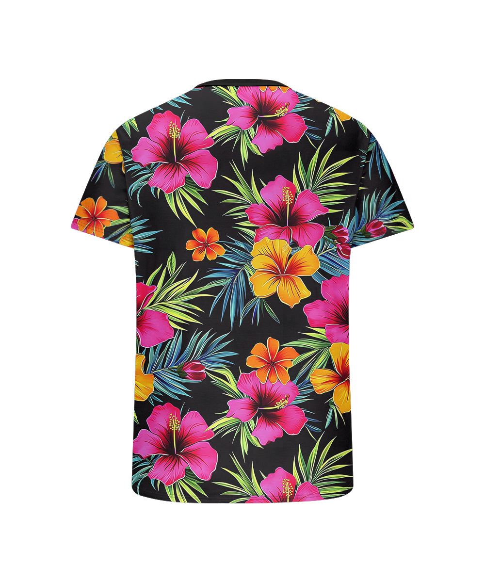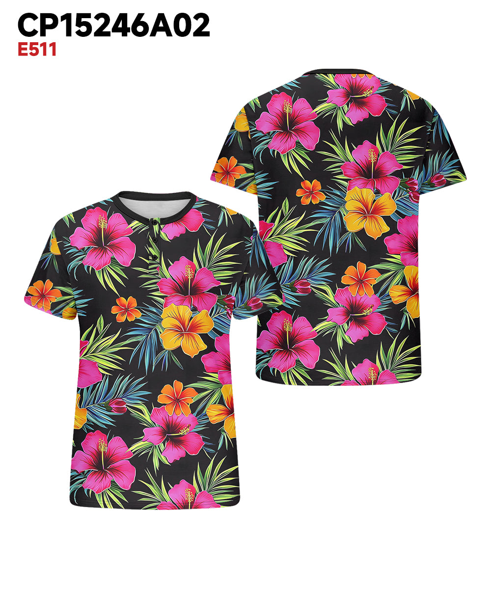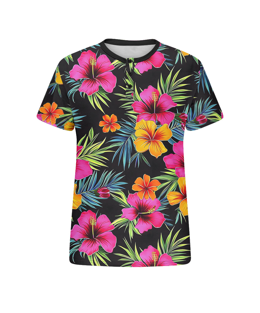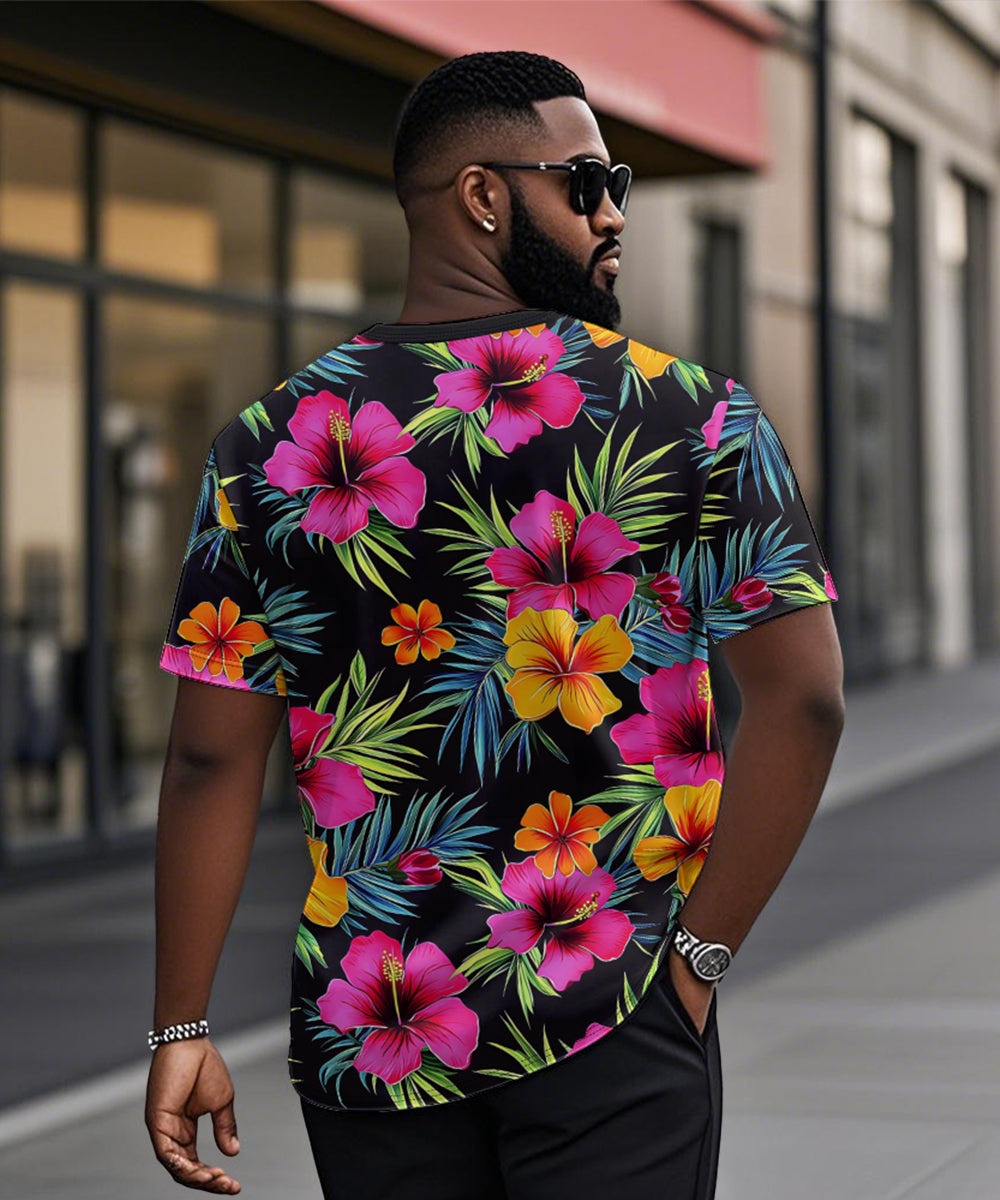 Men's Plus Size Hawaiian Pink Floral Print Henry Collar Button Short Sleeve Tee