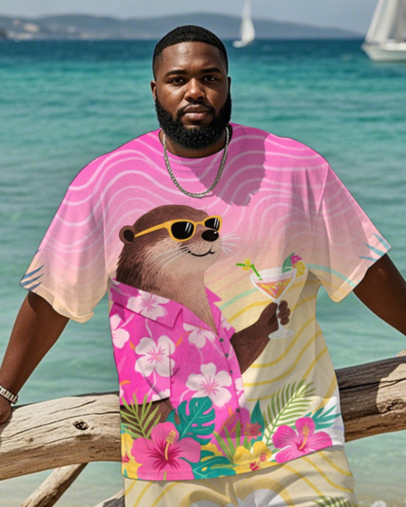 Men's Plus Size Hawaiian Pink Otter Drinking Cocktail Print Short Sleeve T-Shirt Shorts Suit