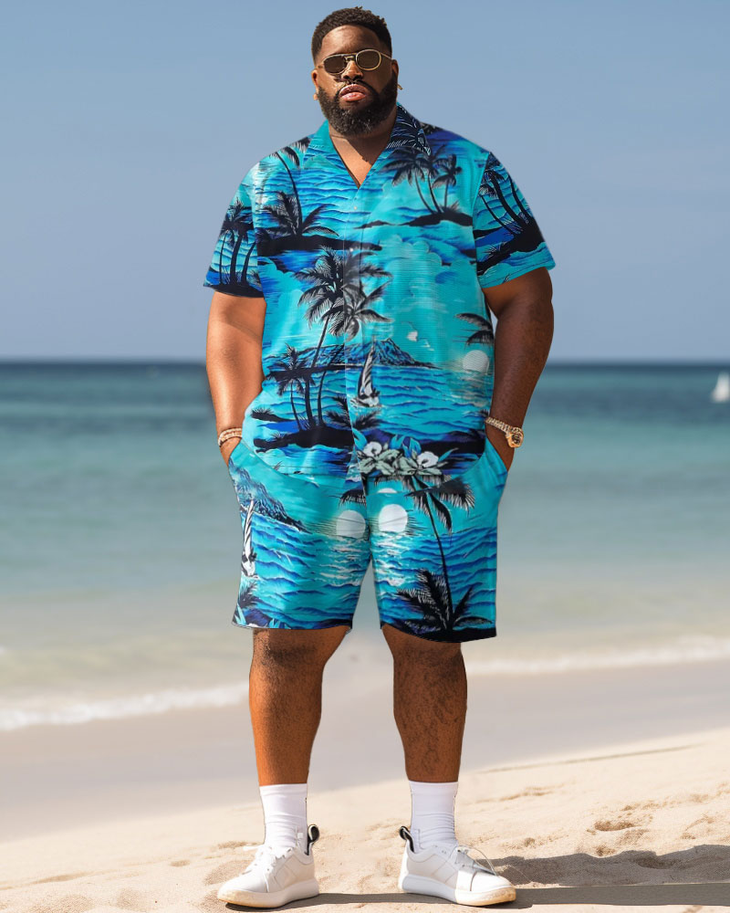 Do the Hawaiian seaside prints make you feel like you are in the sea? This big guy's shirt and shorts set with blue seaside and coconut tree prints makes you feel like you are on a seaside vacation. Loose-cut and bold, this set can make you easily show your grace and comfort.
