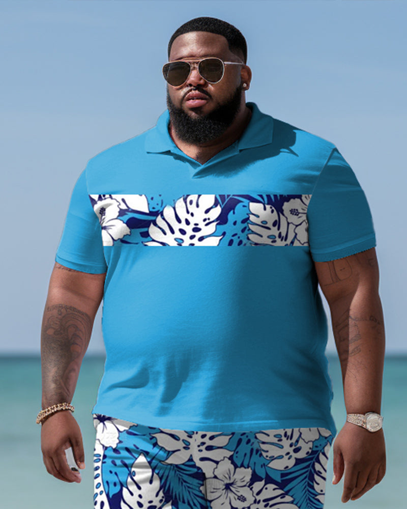 Men's Plus Size Hawaiian Tropical Flora Print Polo Shirt Shorts Suit