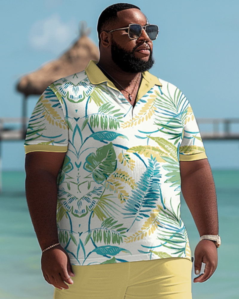 Men's Plus Size Hawaiian Tropical Leaf Polo Shorts Suit