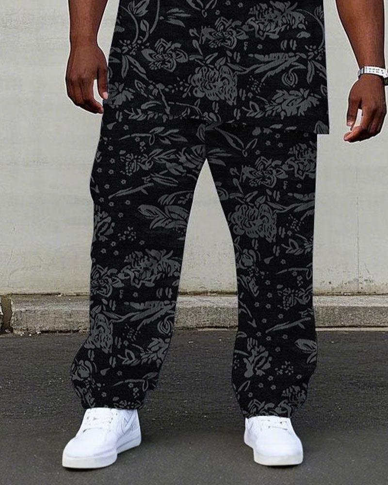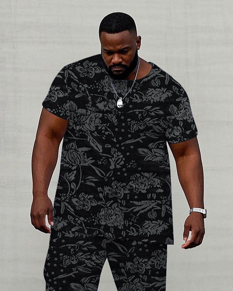 Men's Plus Size High-end Same Color Black Jacquard Flower Craft Fabric Short-sleeved T-shirt Trousers Suit