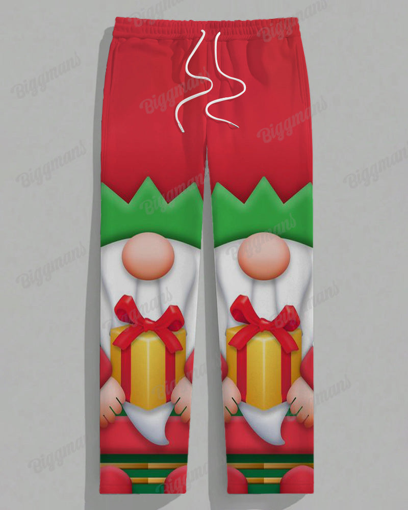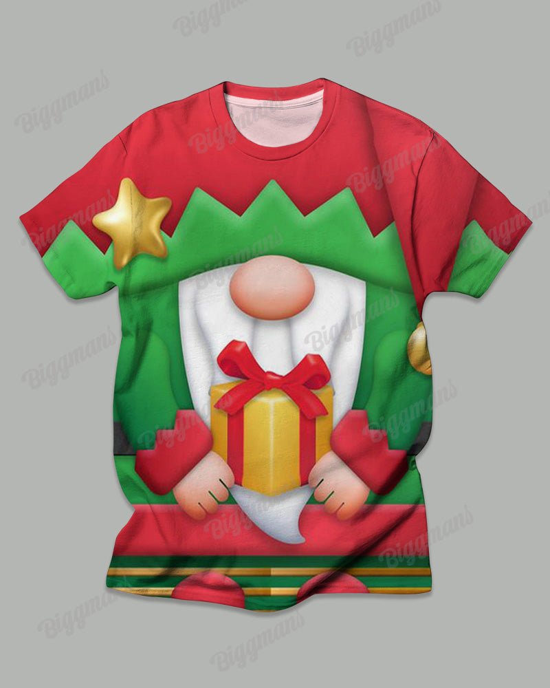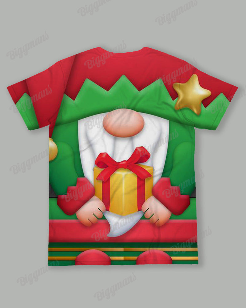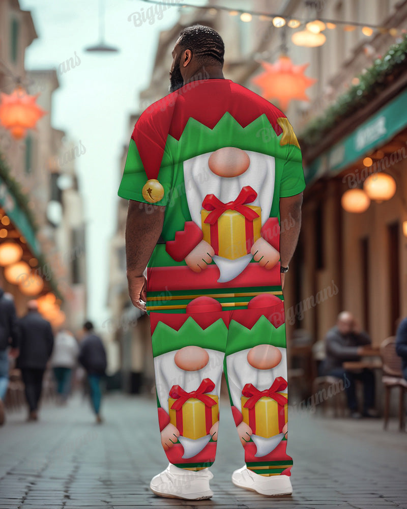 The T-shirt is printed with an old green elf holding a gift, a lovely image that conveys the joy and surprise of Christmas. The trousers are simple and comfortable and fit well with the T-shirt. The overall colour palette is harmonious, highlighting the Christmas character while providing a casual feel for everyday wear, making it an eye-catching choice for the Christmas season.