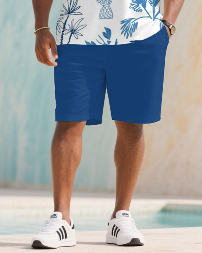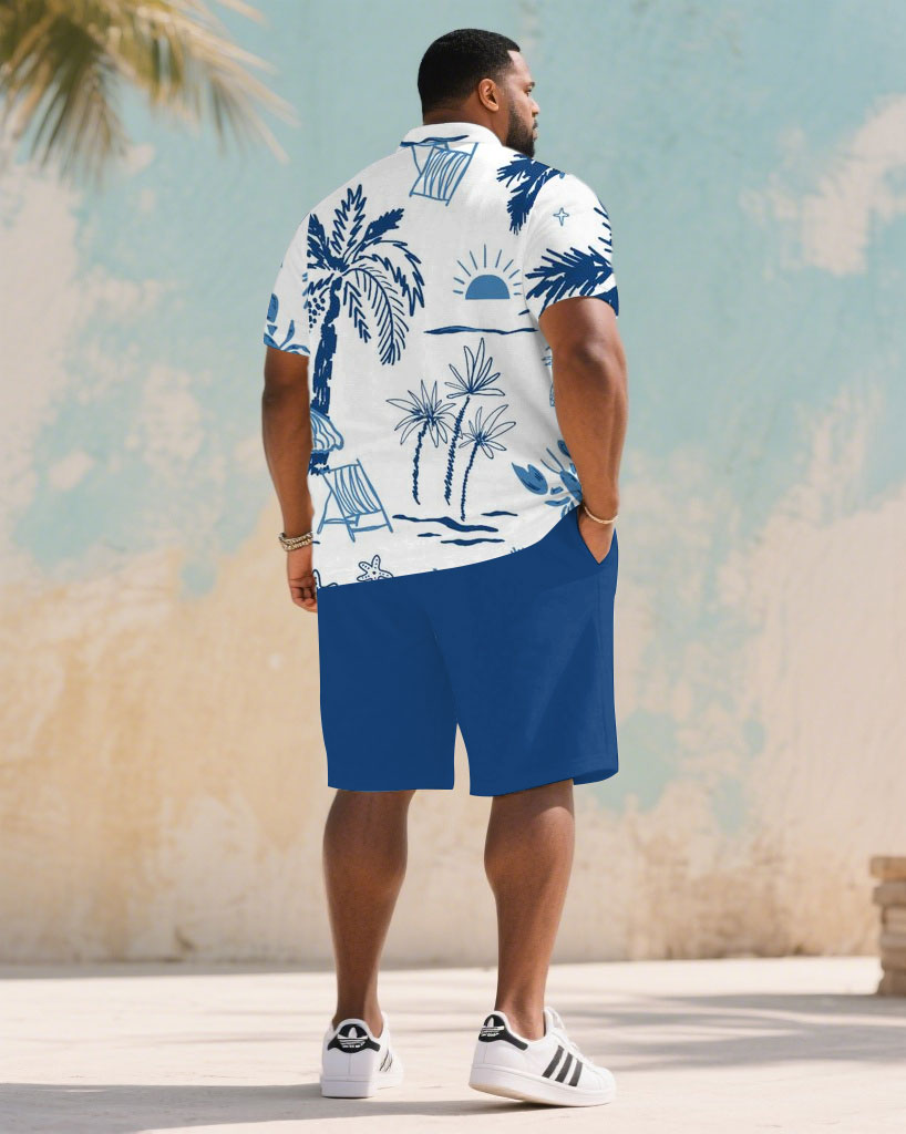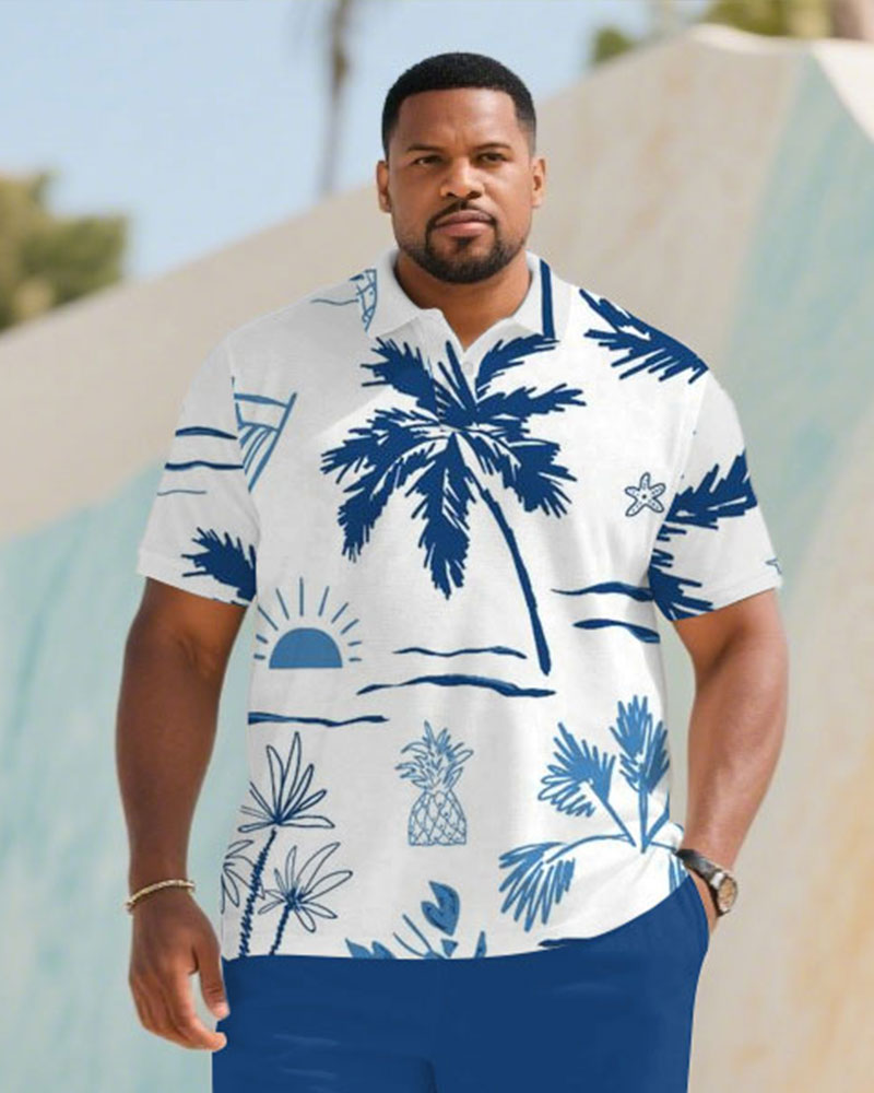 Men's Plus Size Holiday Blue Plant Full Print Short Sleeve Polo Shirt Shorts Suit