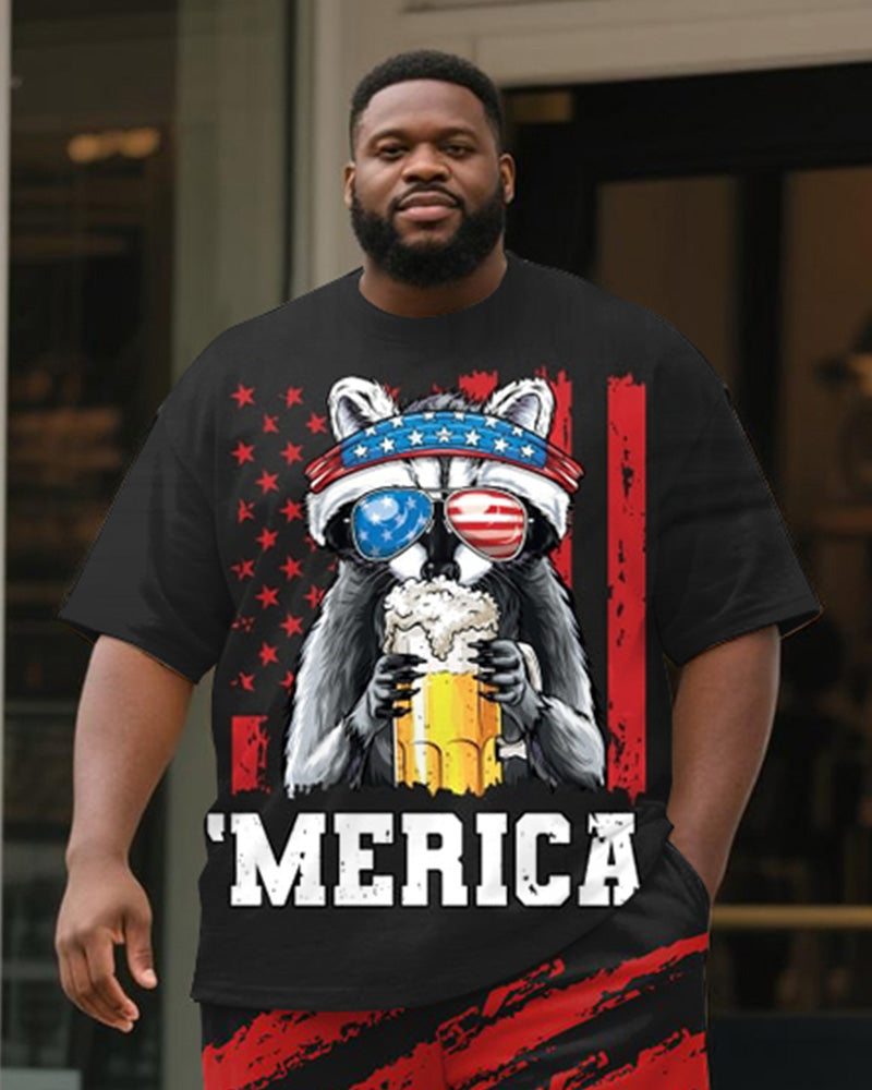 Men's Plus Size Independence Day Raccoon Merica Alphabet Print Round Neck Short Sleeve T-Shirt Shorts Suit