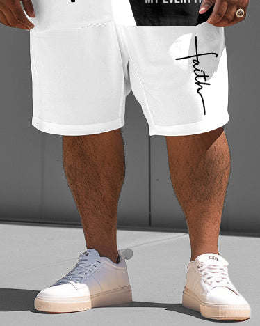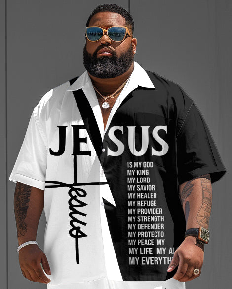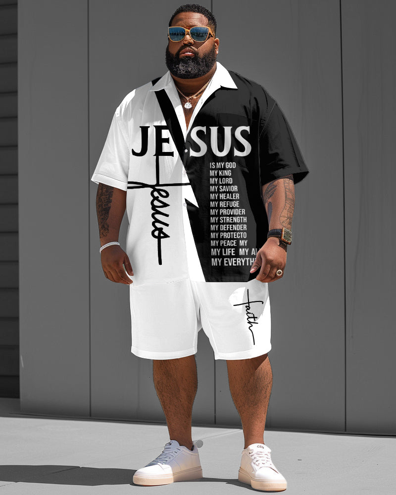This men's two-piece set is inspired by the Bible of Jesus. The black-and-white is simple while the prints of Jesus and Bible content are integrated to show a unique attitude of faith. Its oversized design brings unrestrained comfort and is suitable for various matching, showing your fashion sense in summer leisure activities!