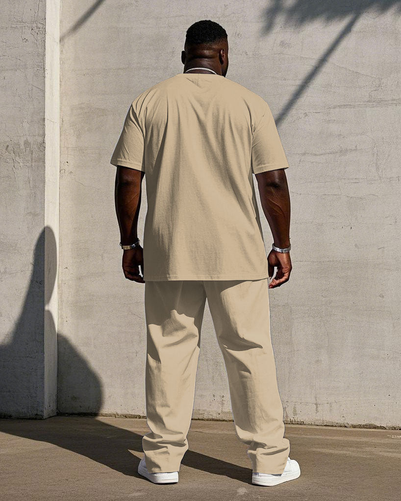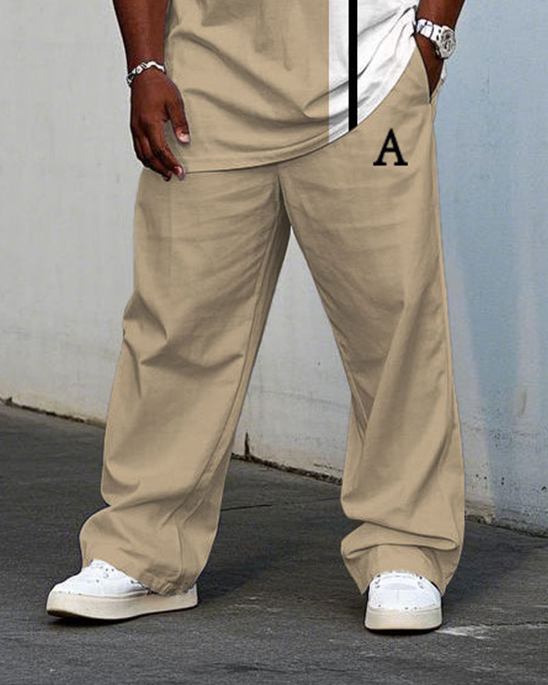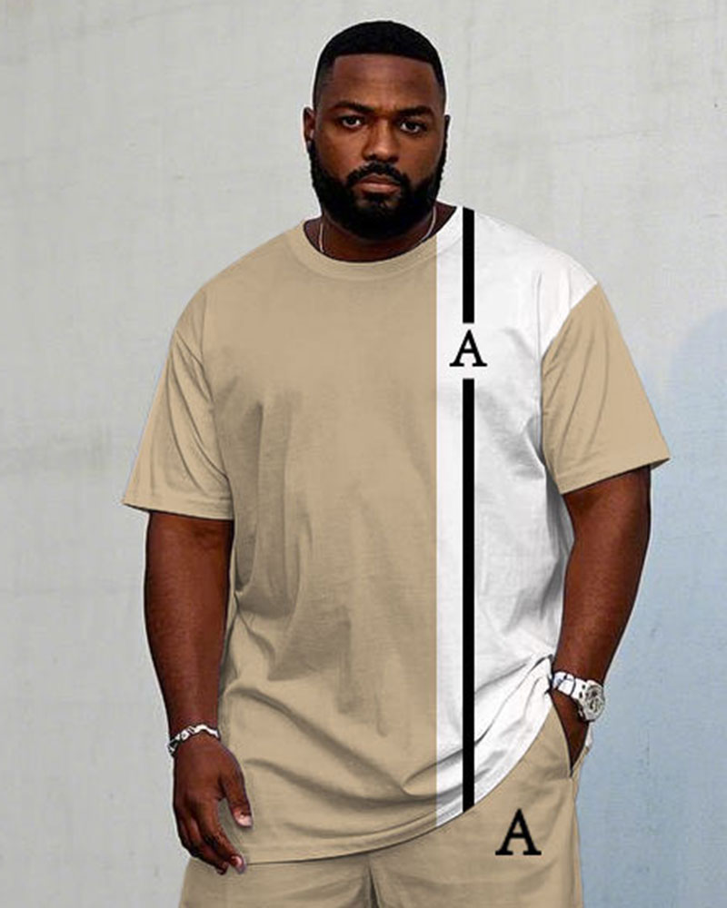 Men's Plus Size Khaki & White Slim Colorblock Small Label Printed Short Sleeve T-shirt Trousers Suit