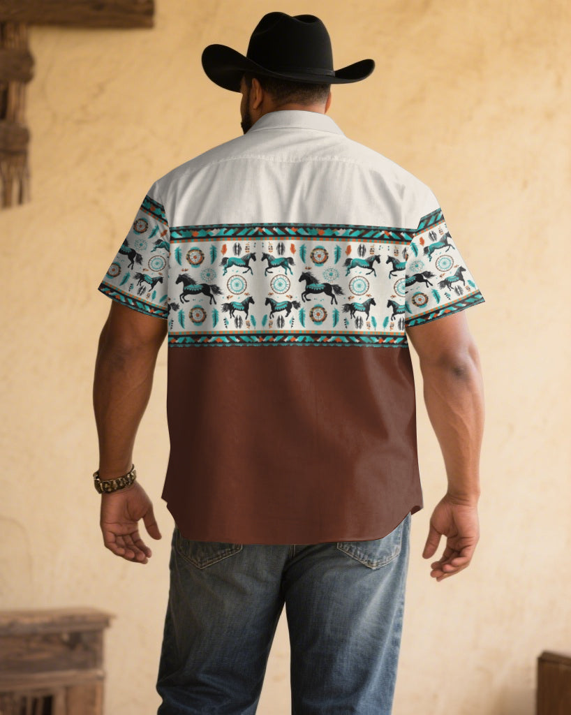 Men's Plus Size Khaki & White Western Denim Patchwork Printed Short Sleeve Shirt